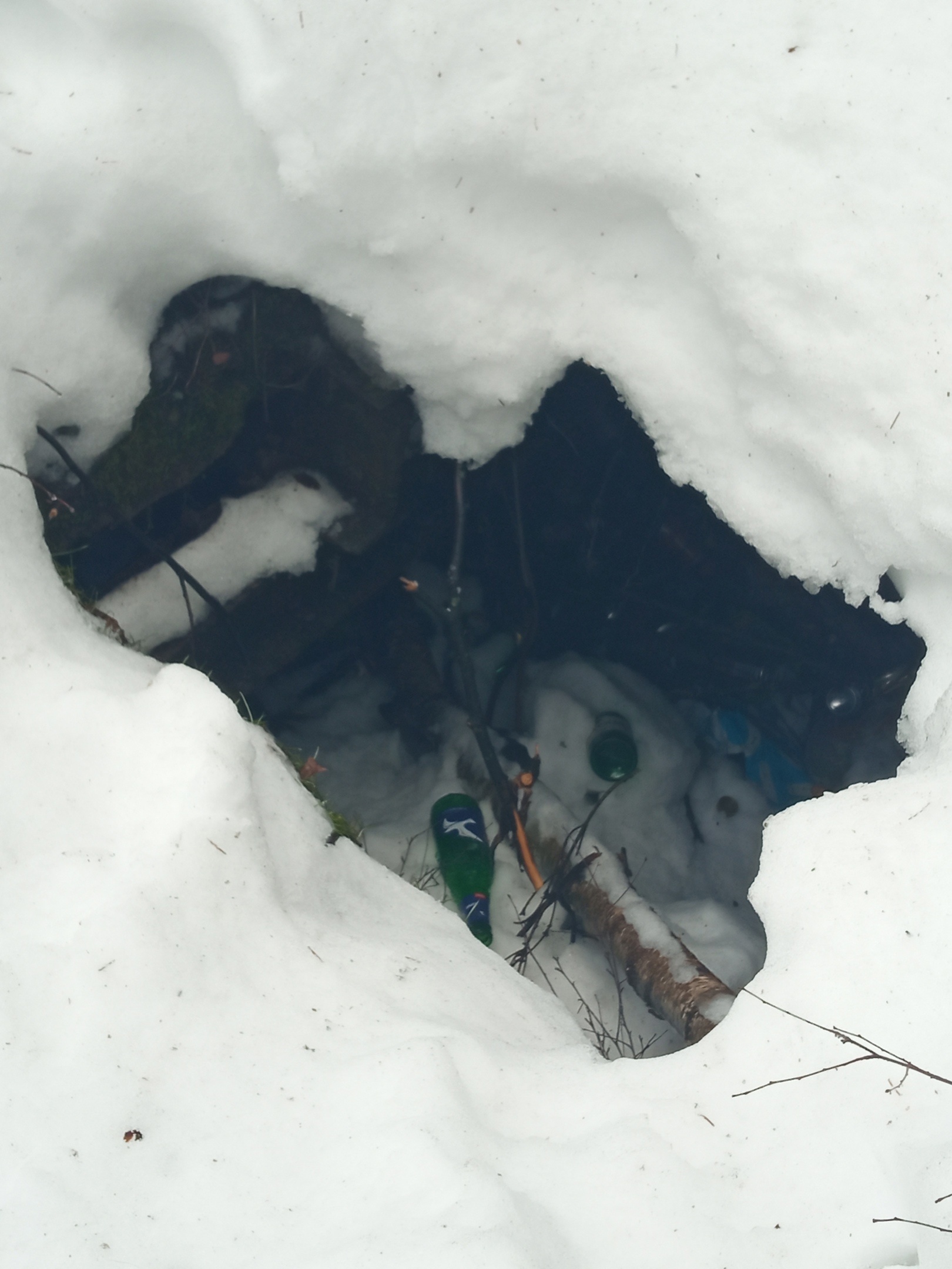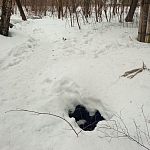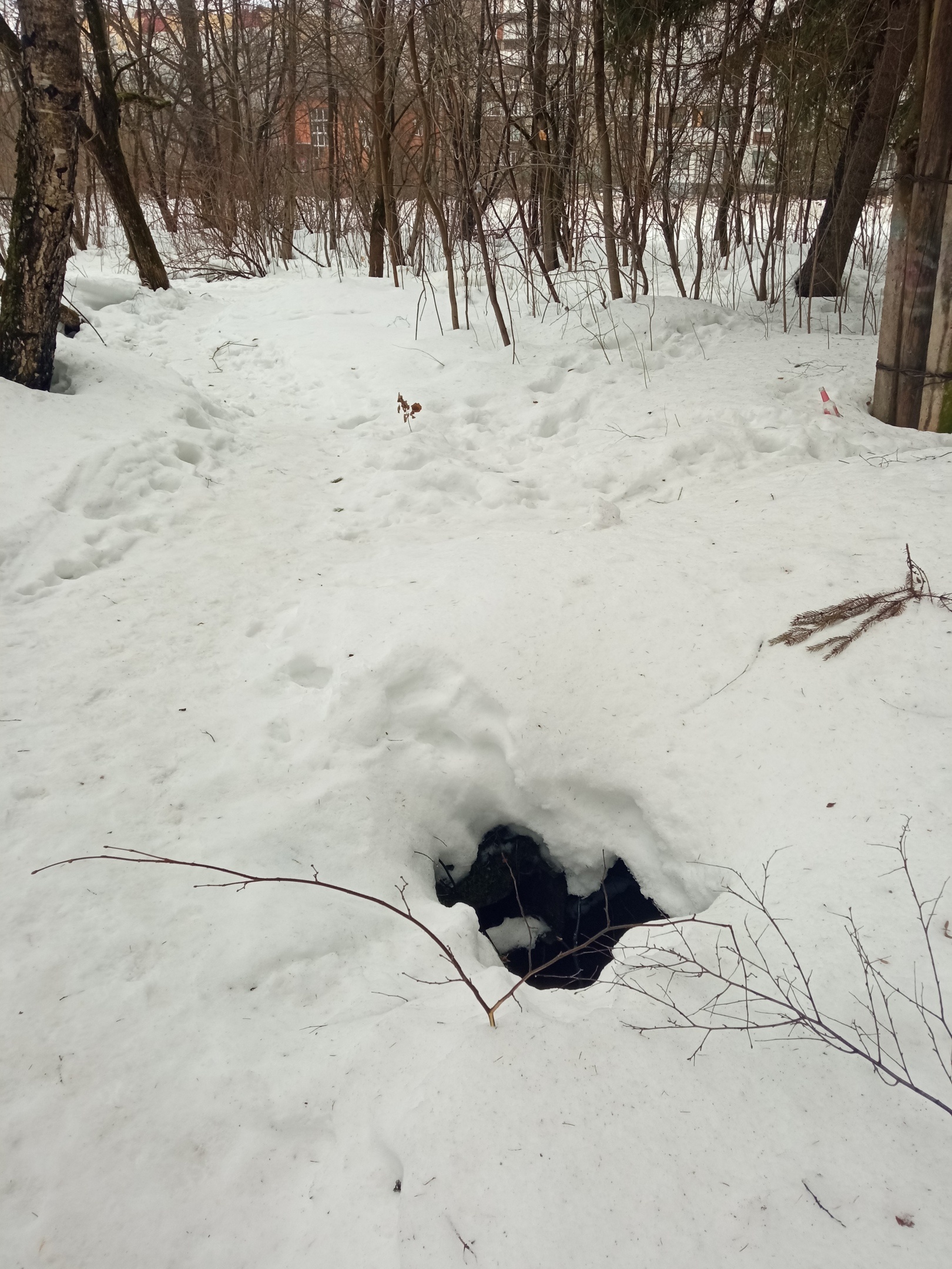 Эта мега яма находится прямо у тропинки. Не то, чтоб меня волновала судьба пьяни, которая вечно тут ошивается и под градусом может провалиться. Но тут ещё и дети ходят постоянно, и далеко не всегда смотрят под ноги. Летом её ещё и из-за растений не так хорошо видно.