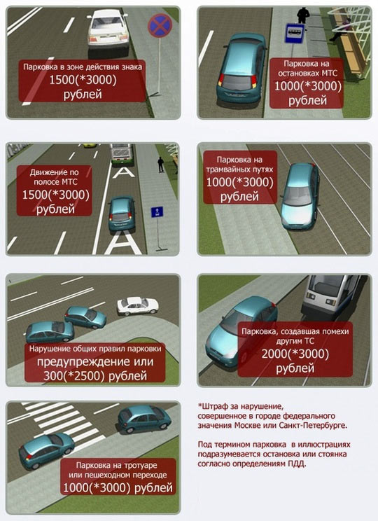 Все вышеперечисленные нарушения правил остановки или стоянки, совершенные в Москве или Санкт-Петербурге (городах федерального значения), будут наказываться административным штрафом в размере 3000 руб. Остальные нарушения правил остановки или стоянки будут наказываться предупреждением или административным штрафом в размере 300 руб., а в городах федерального значения — 2500 руб.