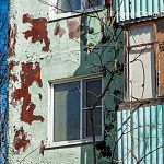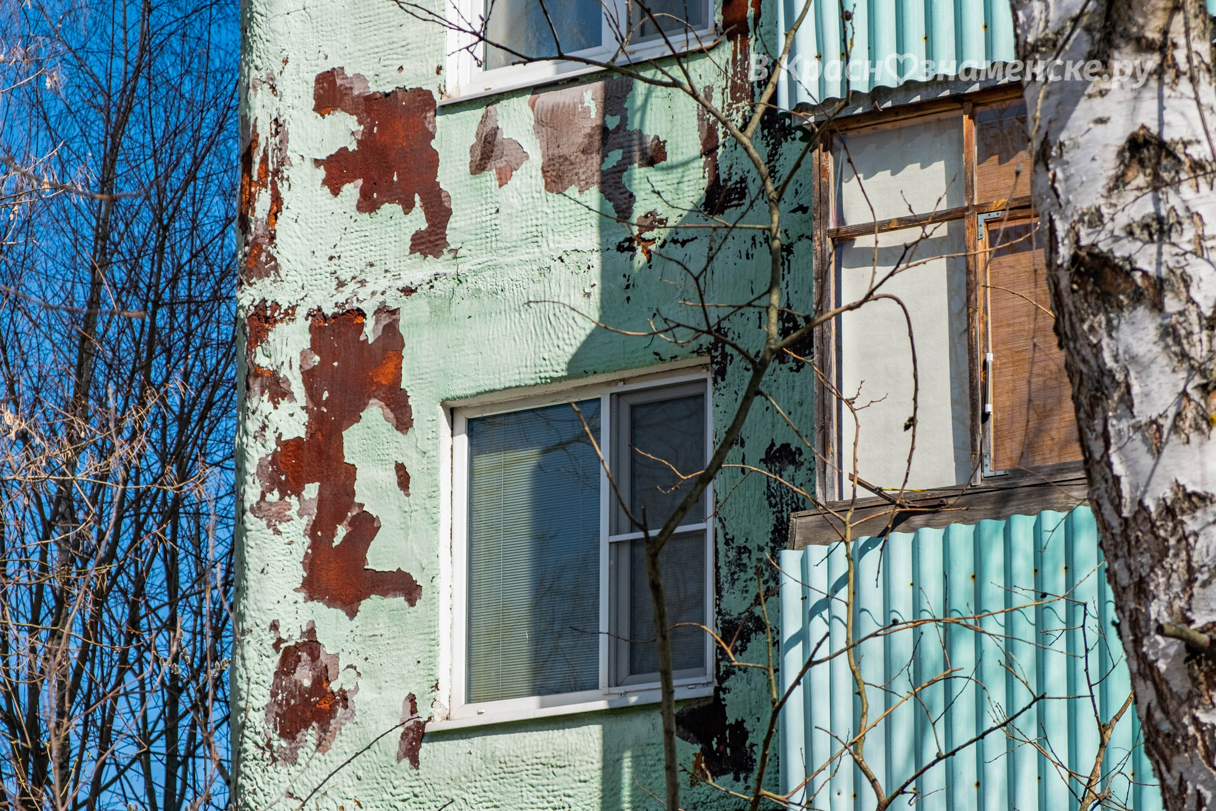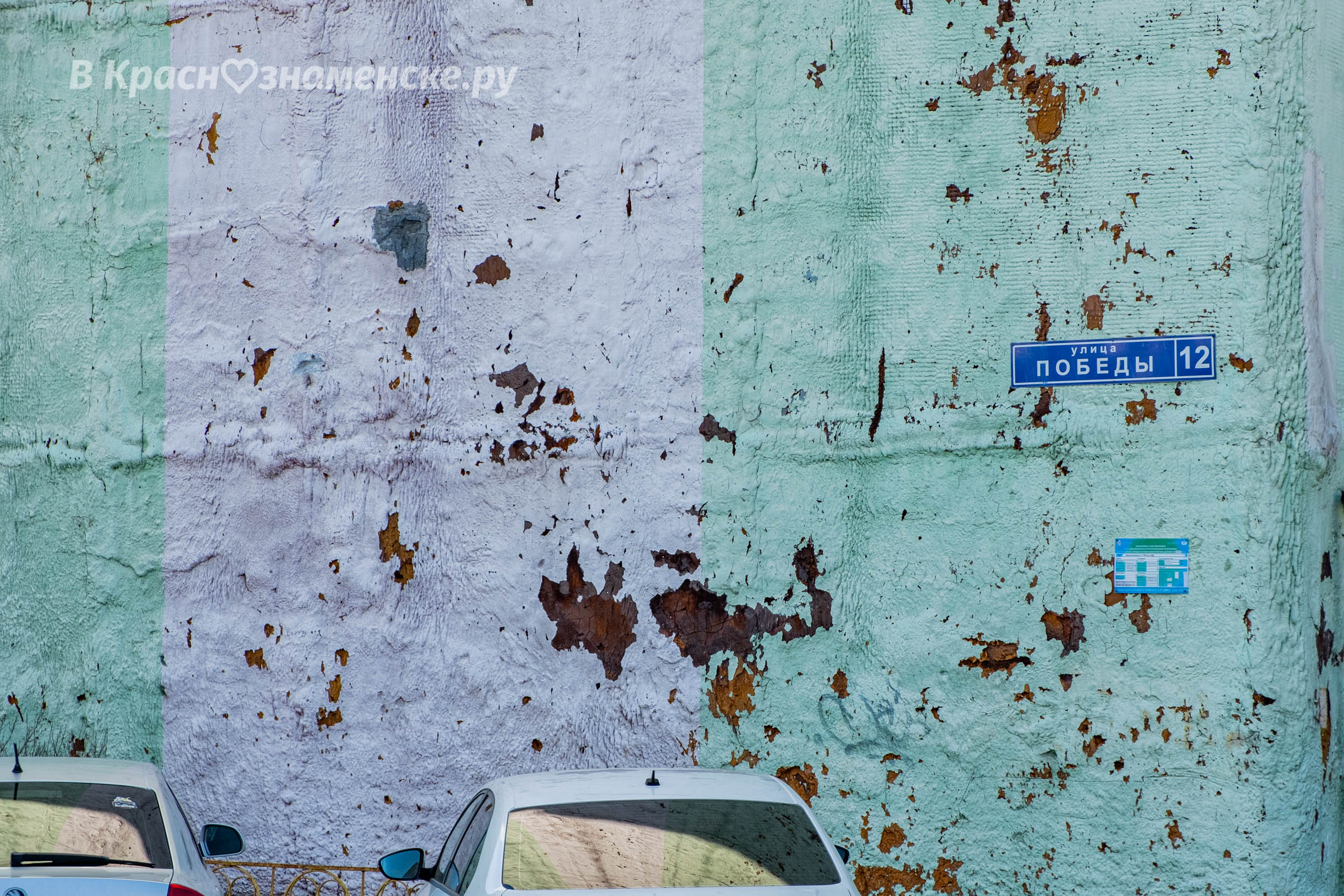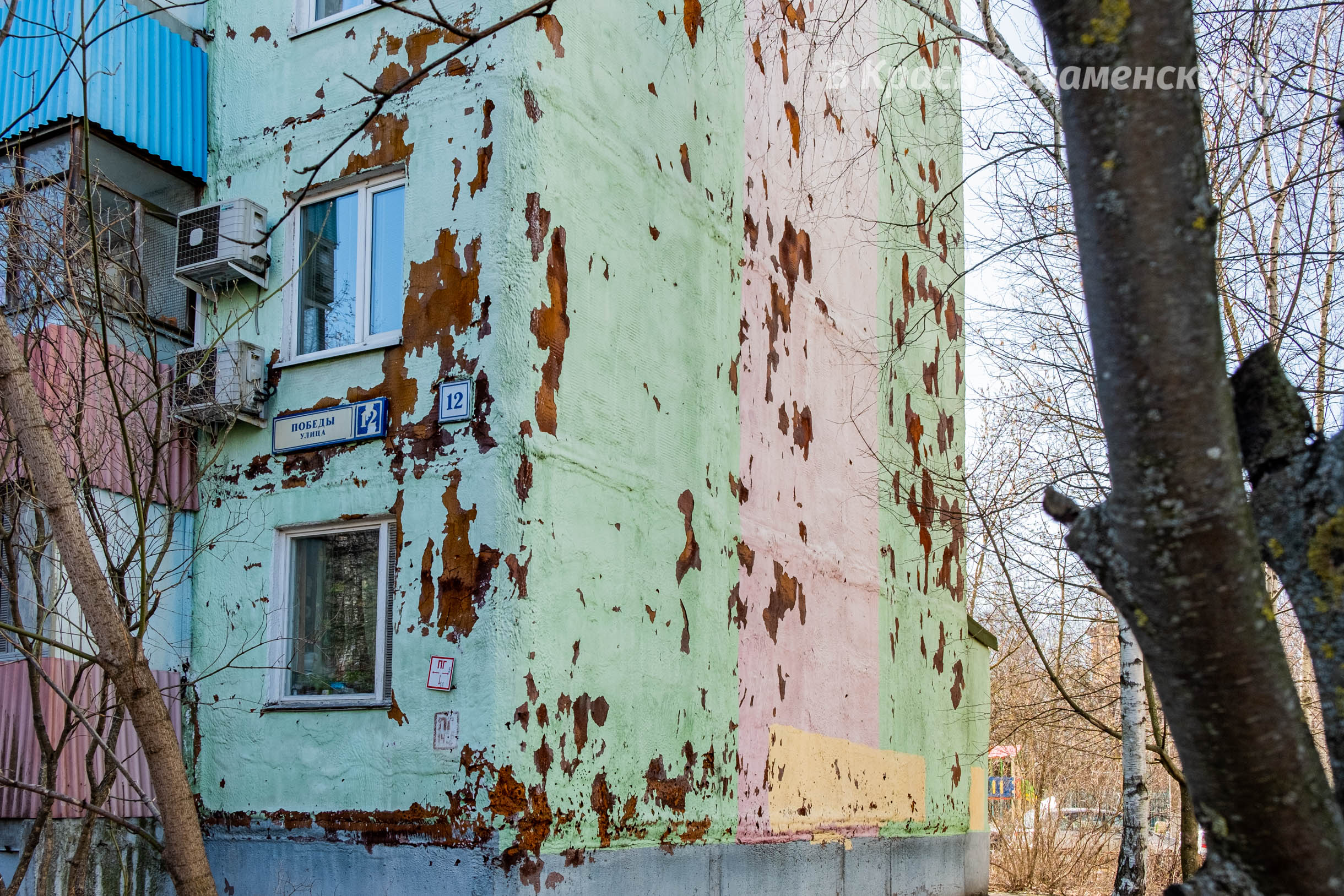Дом на ул. Победа 12 уже много лет выделяется на общем фоне своими "ржавыми" пятнами. Причиной тому устареревшая технология утепления фасада, поверх которой нанесли штукатурку. Со временем и по причине различных факторов, штукатурка местами начала отваливаться в результате чего, перед нашим взором и появлялись эти пугающие пятна.