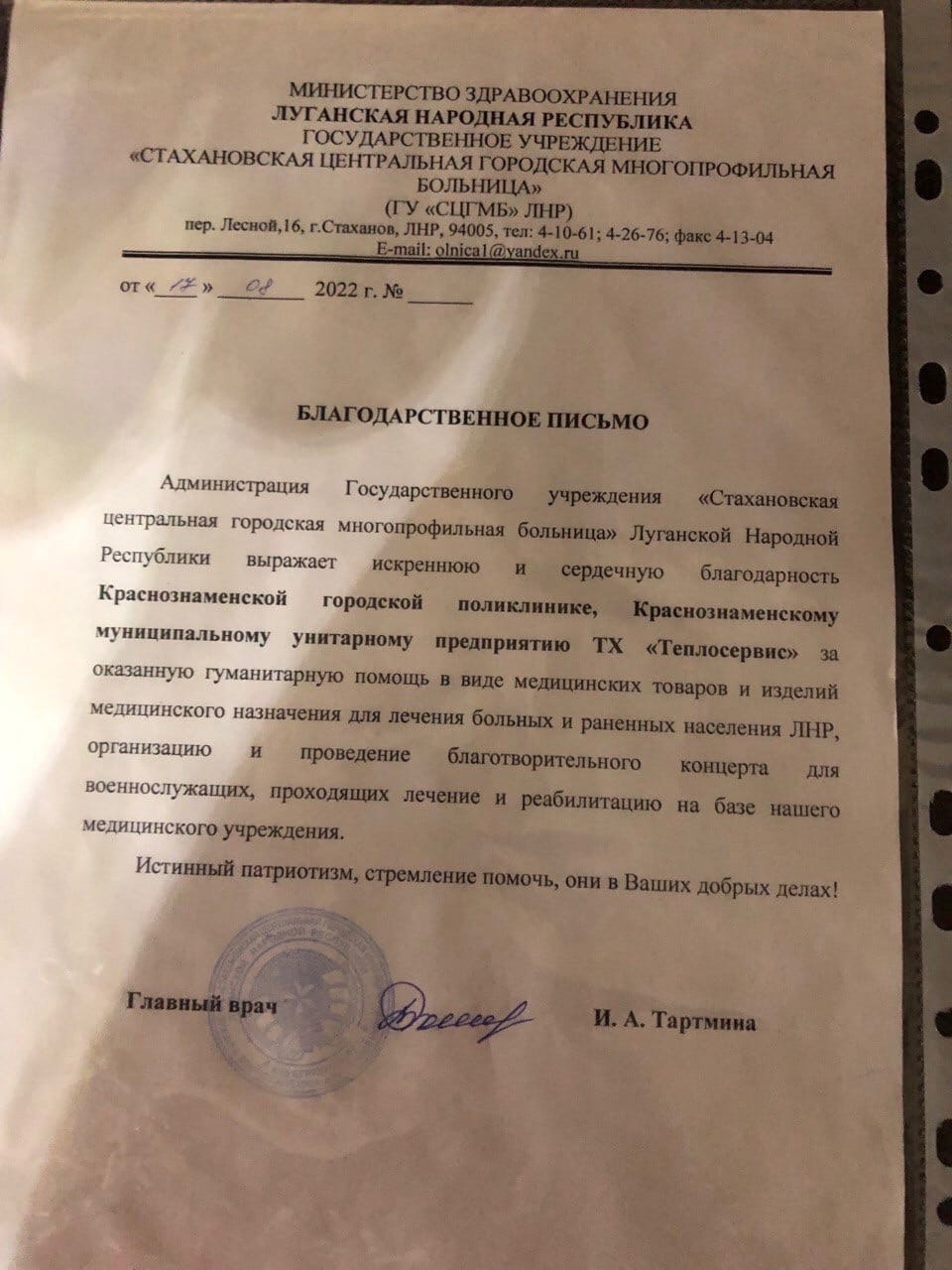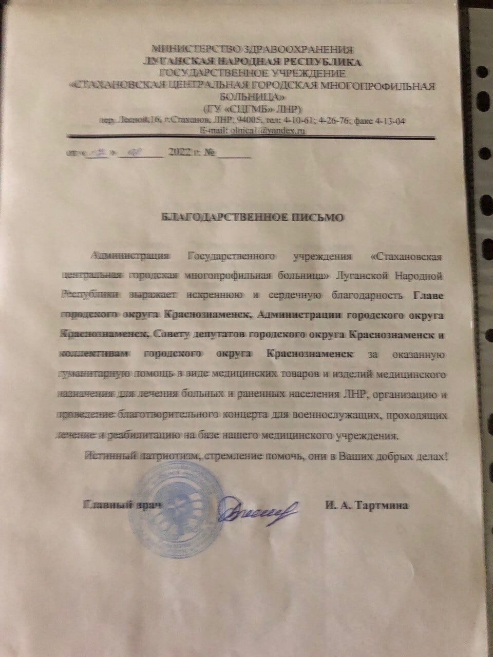 Благодарственные письма от центральной городской многопрофильной больницы ЛНР в адрес Краснознаменска