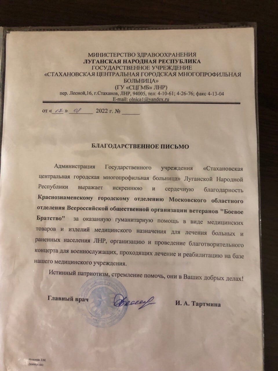 Вот такие благодарственные письма от Стахановской центральной городской многопрофильной больницы Луганской народной республики пришли в адрес Краснознаменских учреждений за оказанную поддержку жителям республики, которая была им доставлена нашим городским отделением МОО ВООВ «БОЕВОЕ БРАТСТВО».