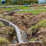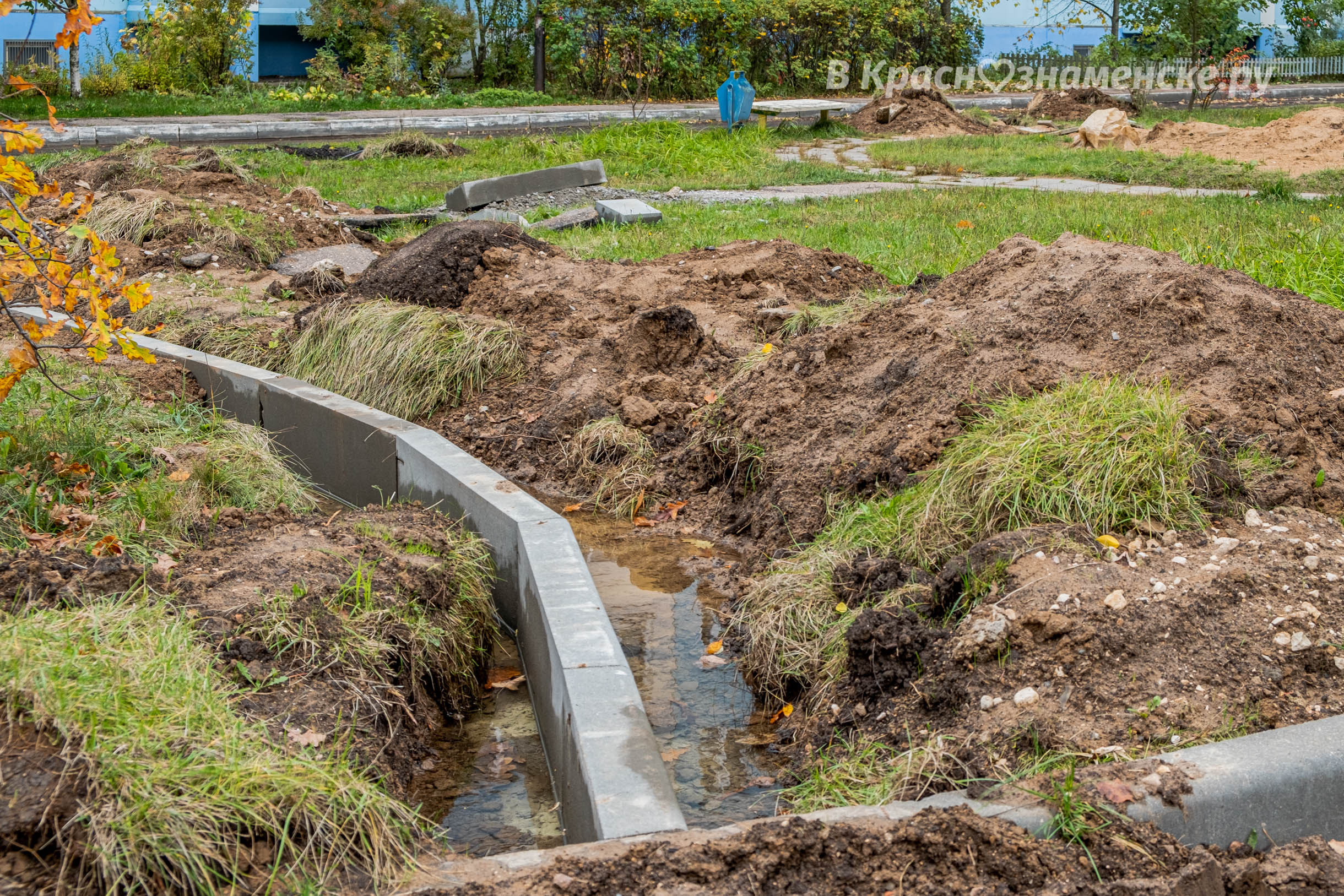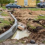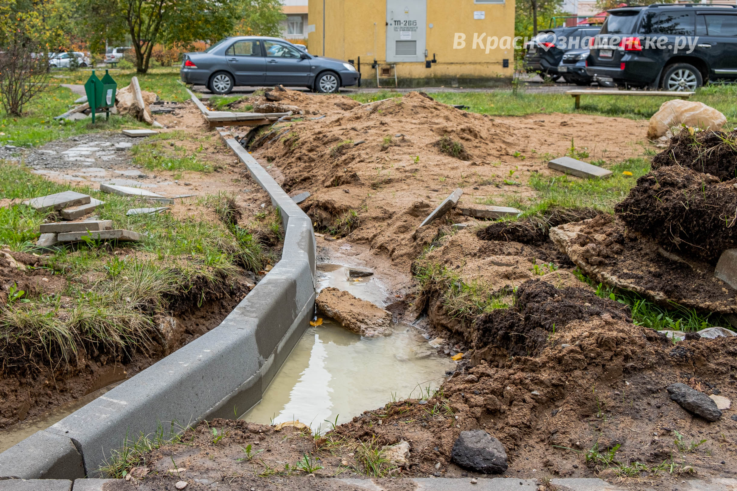 Понимаем, заниматься укладкой асфальта в дождь затея не из лучших, но ведь и сказать, что он с августа не переставая льёт тоже не получится, учитывая, что за этим же домом погода не помешала доделать тротуар.