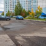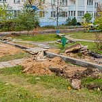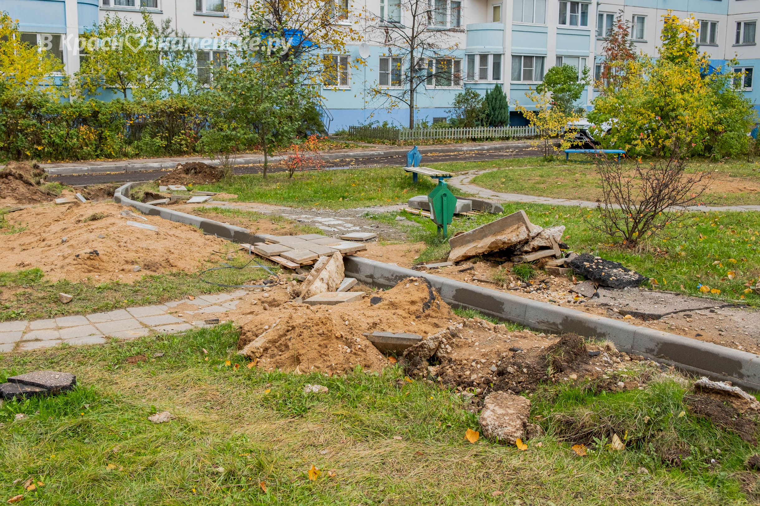 Монтаж старого асфальтового покрытия во дворе дома по адресу ул. Связистов 12, был осуществлён ещё в августе, установка нового бордюра около площадки началась примерно в тоже время.