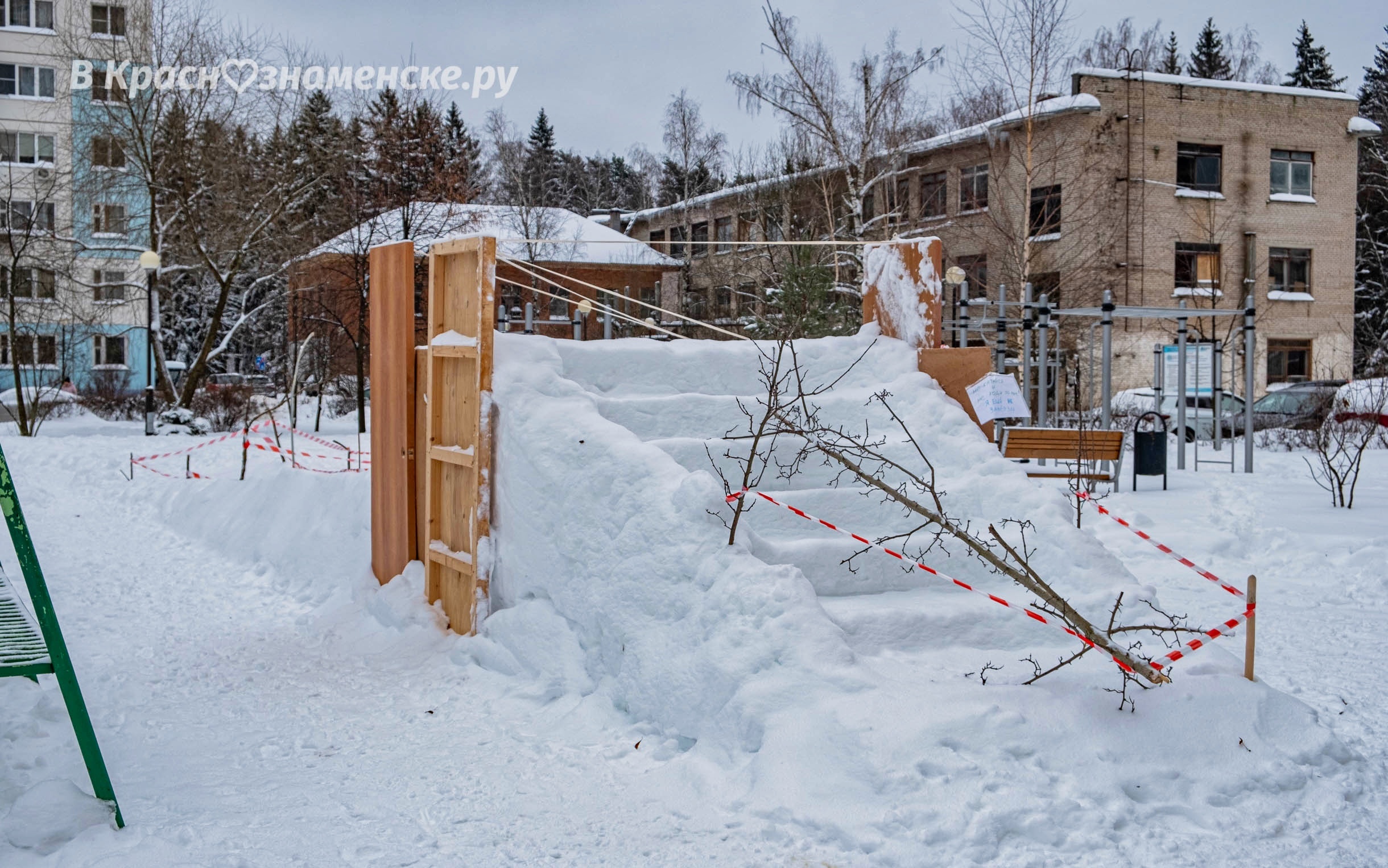 Чтобы дети не бились о столбы да скамейки, скатываясь с горки, заботливые архитекторы парка предусмотрели зимние отбойнички