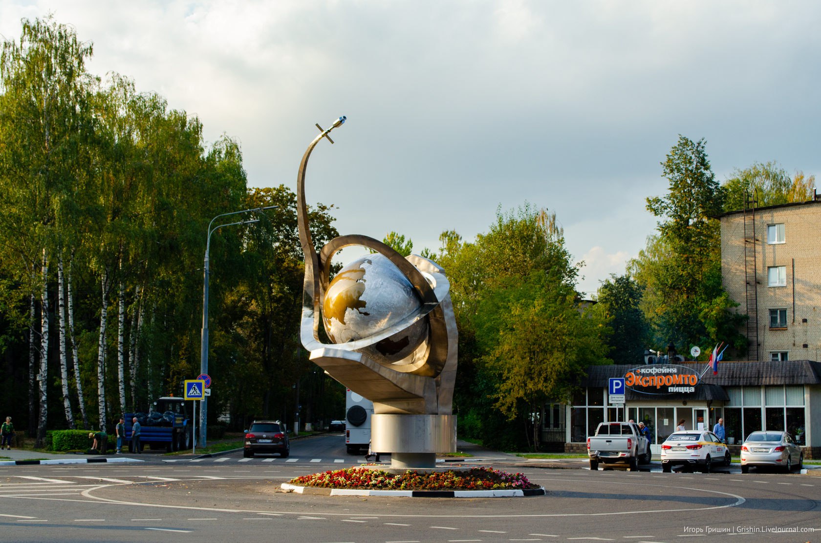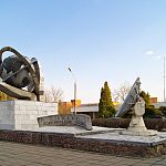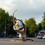На территории ЦУС стоит памятник покорителям космоса в виде шара в ладонях.