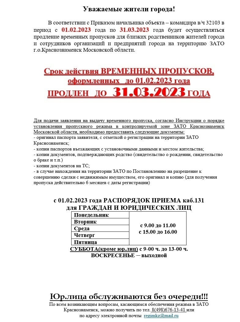 В соответствии с Приказом начальника объекта – командира в/ч 32103 в период с 01.02.2023 года по 31.03.2023 года будет осуществляться продление временных пропусков для близких родственников жителей города и сотрудников организаций и предприятий города на территорию ЗАТО г.о. Краснознаменск Московской области.