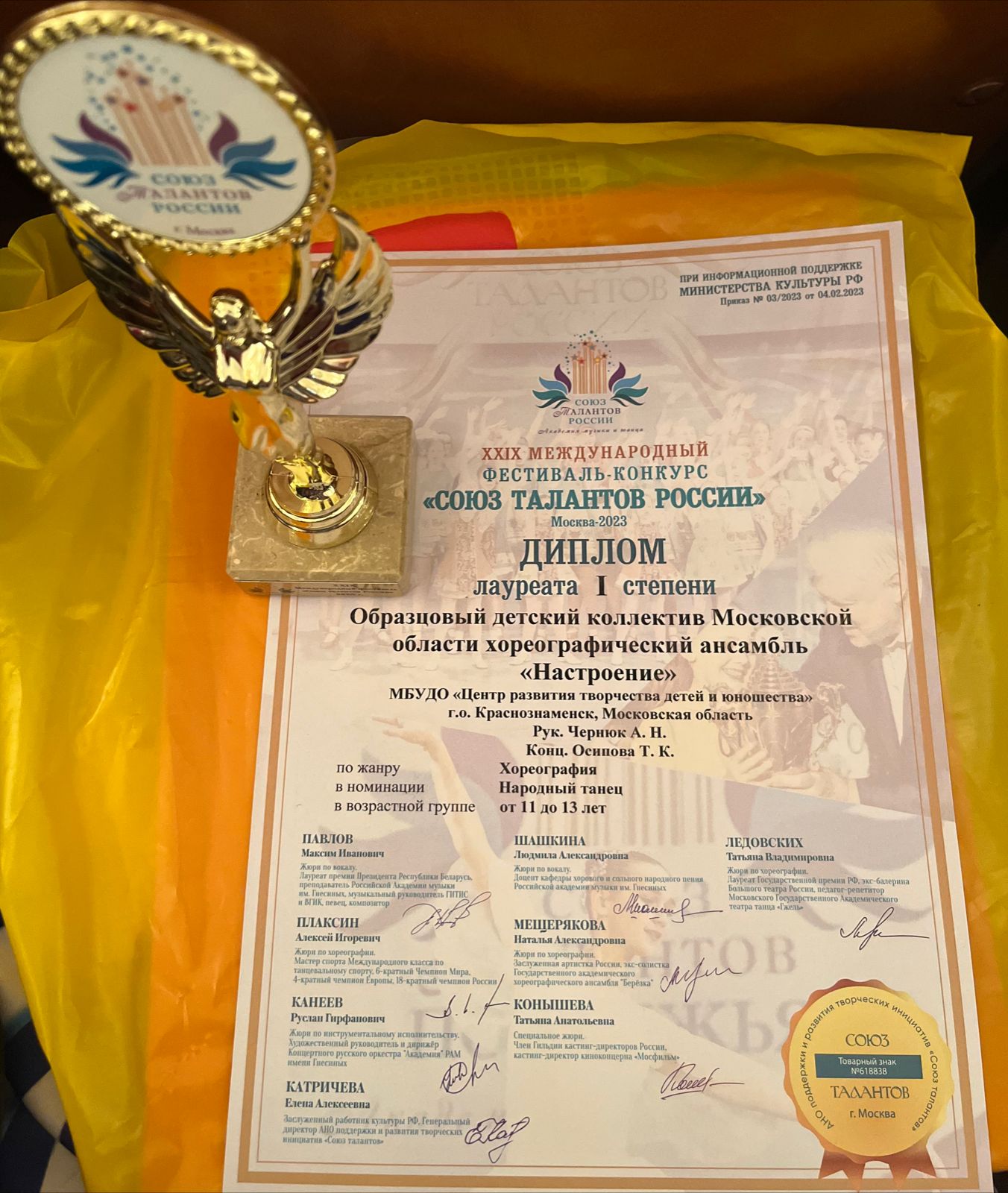 31 мая Образцовый детский коллектив Московской области «Хореографический ансамбль «Настроение» Центра развития творчества детей и юношества (педагог Чернюк Алевтина Николаевна, концертмейстер Осипова Татьяна Кирилловна) принял участие в XXIX Международном фестивале-конкурсе «Союз талантов России», который проходил в Колонном зале Дома Союзов. Коллектив получил диплом Лауреата 1 степени в номинации «Народный танец» (возрастная группа от 11 до 13 лет по жанру «Хореография»). Поздравляем обучающихся и педагогов и желаем им дальнейших успехов в творческой деятельности!