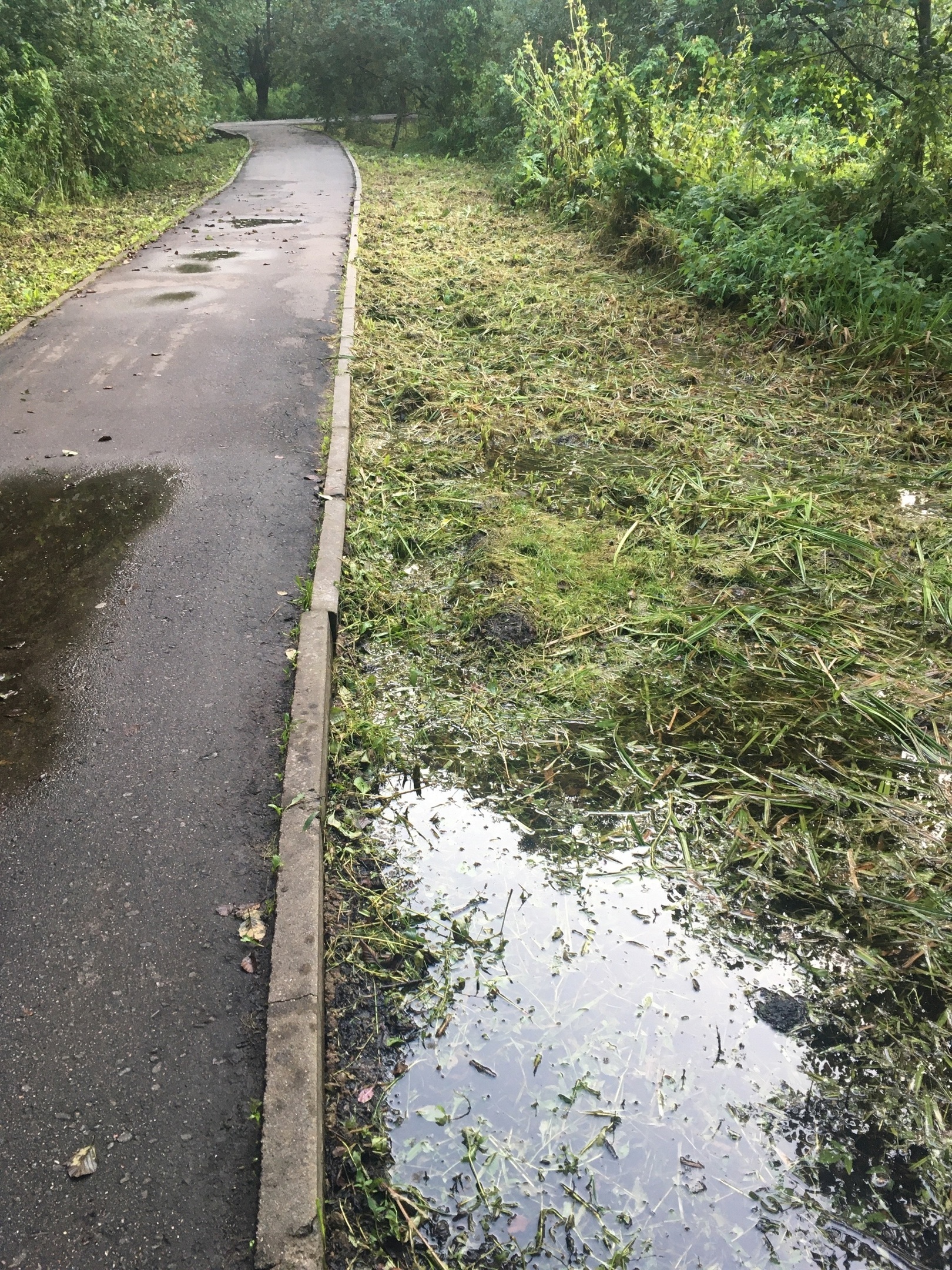Было бы разумно пройти по лесу (или лесопарку) за озером вместе с рабочими, которым поручено скосить траву. Вы бы увидели, где косить однозначно не надо. Например, дорожка, вдоль которой растёт осока- трава очень красивая, декоративная, её специально сеют на газонах. Посмотрите, как красиво она смотрится.(1,2,3 фото) А теперь посмотрите, как было у нас в лесу( 4-ое фото) и как стало(5-ое фото).