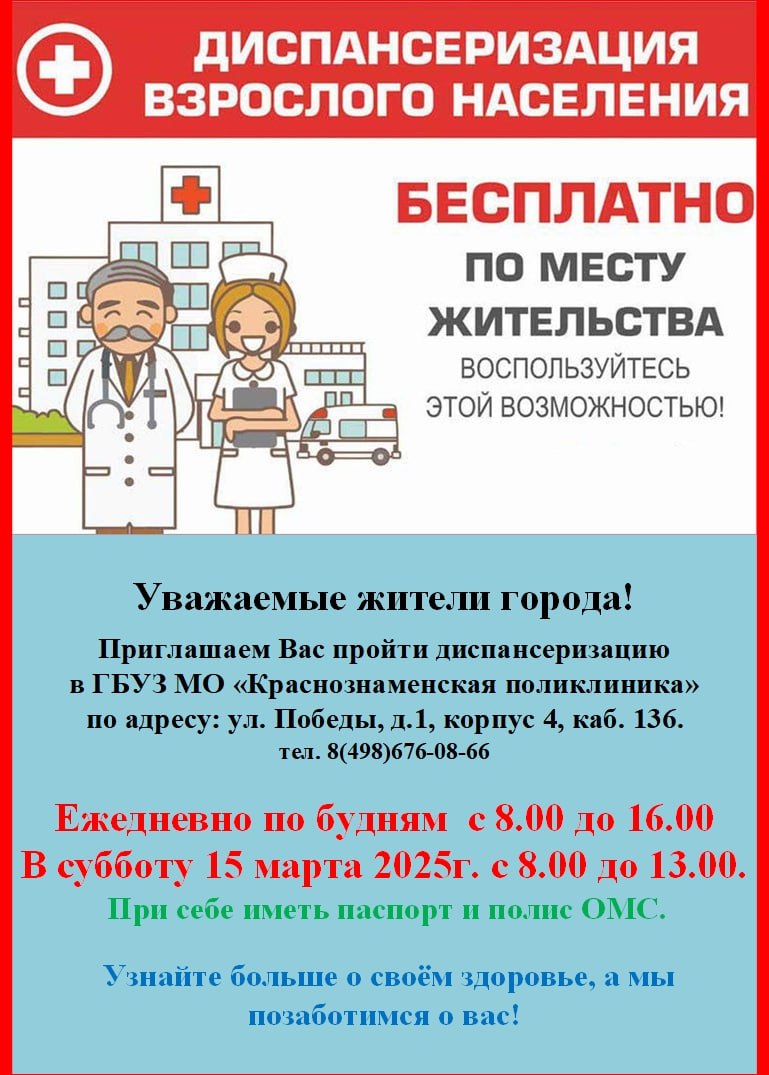 Приглашаем Вас пройти диспансеризацию в ГБУЗ МО "Краснознаменская поликлиника" по адресу: