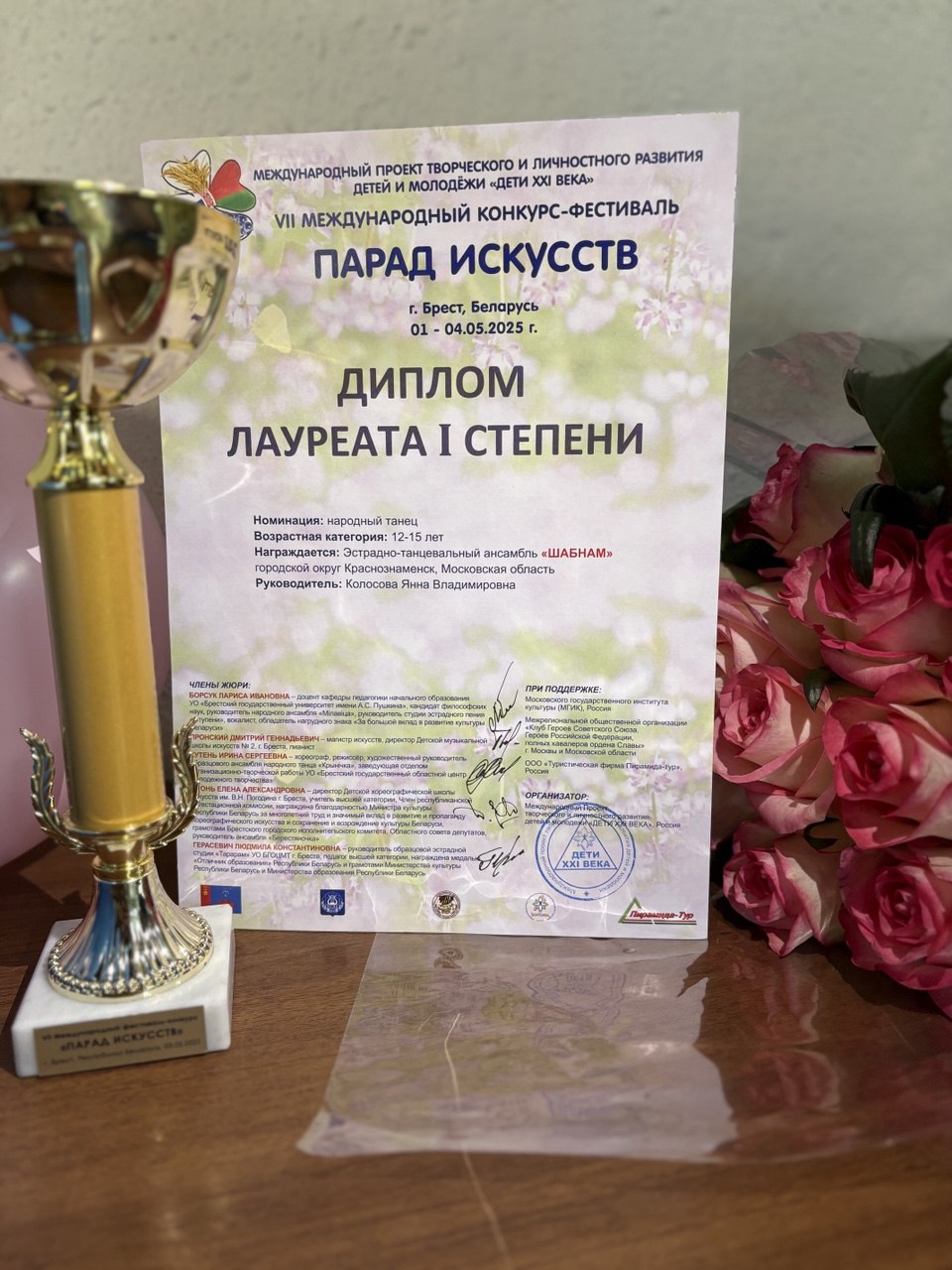 Эстрадно- танцевальный ансамбль «Шабнам» ( руководитель Колосова Я. В.) достойно представил наш Краснознаменск в городе Брест. Коллектив «Шабнам» стал единственным Лауреатом 1 степени в номинации "Народный танец"!!! Жюри во время обсуждения отметило , что девочки «Шабнама» со своими двумя танцами были самыми яркими участниками в этом Международном конкурсе «Парад искусств». Молодцы! Победа в Международном (очном) конкурсе - это заслуженная награда коллектива!!! Гордимся!!!
