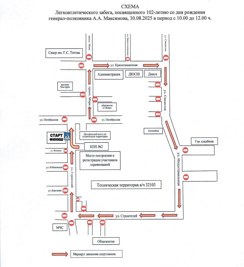 В связи с проведением легкоатлетического забега, посвященного 102-летия со дня рождения генерал-полковника А.А. Максимова, 30 августа в период с 10.00 до 11.00 будет действовать временная схема дорожного движения