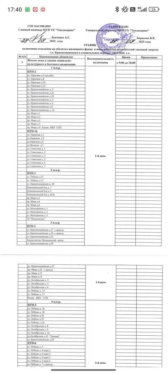 С 24 сентября тепло поступит в социально значимые объекты, такие как детские сады, школы, больницы и другие учреждения. С 29 сентября отопление будет подано в многоквартирные дома и остальные здания.