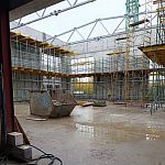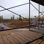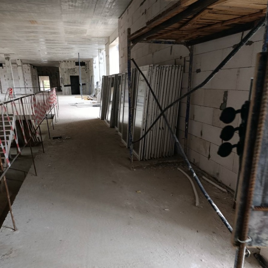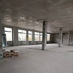 На строительной площадке идут работы по монтажу окон 1-го этажа школы и детского сада, демонтажу лесов спортивного и актового зала, затарке песка в техподполье школы. Степень готовности объекта — 40%.