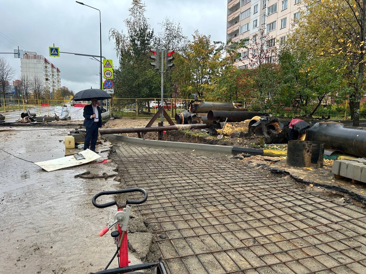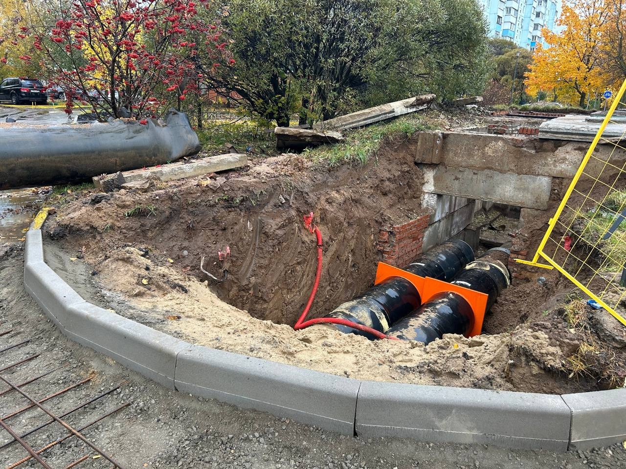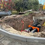 - На участке капитального ремонта тепловой сети проходит разработка грунта с вывозом, обратная засыпка песком с послойным уплотнением, устройство бордюров, сварка труб и армирование железобетонного основания под проезды.