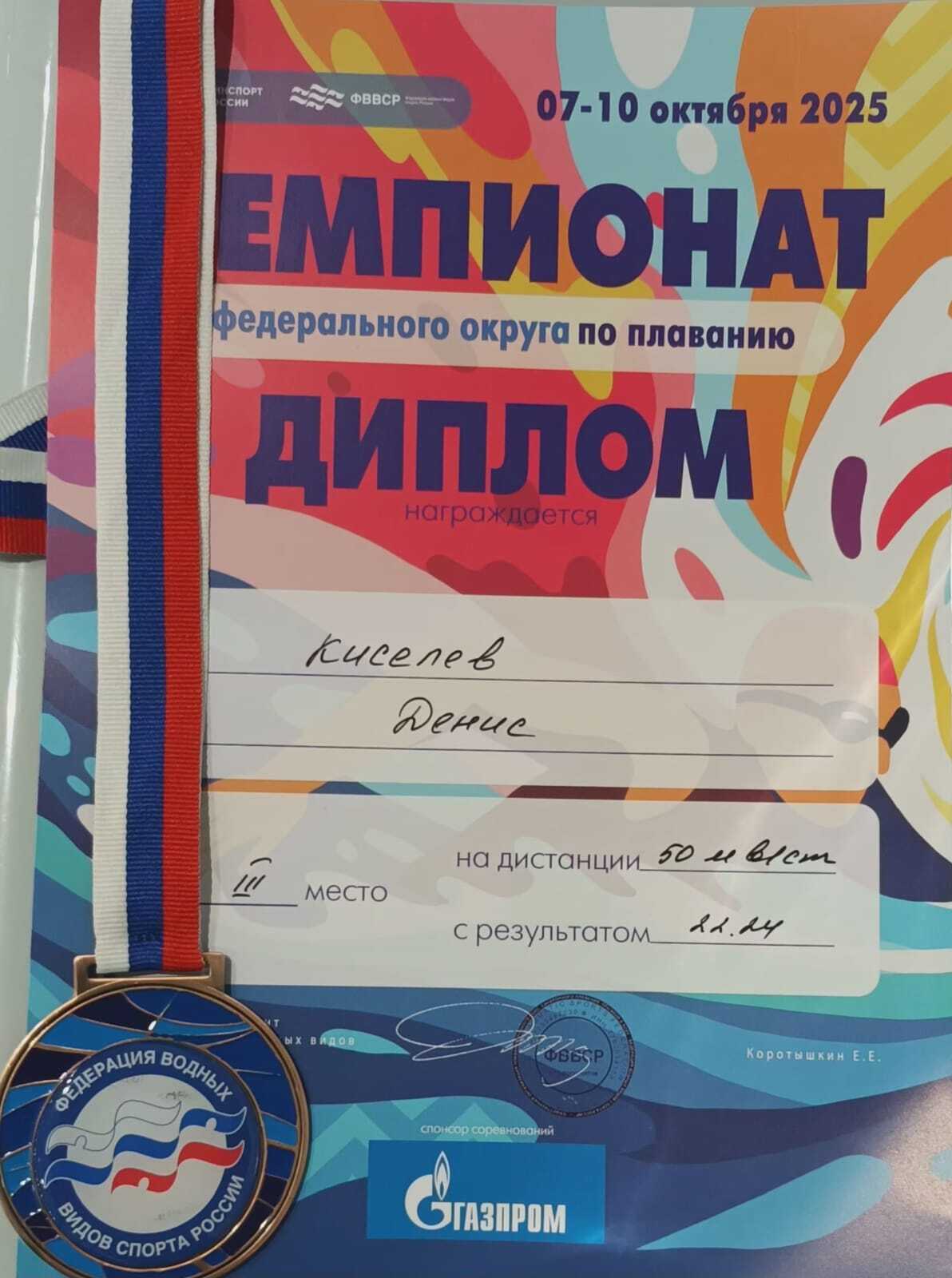 С 7 по 10 октября 2025 года в г. Руза прошел чемпионат Центрального федерального округа (ЦФО) по плаванию. В чемпионате принял участие обучающийся спортивной школы Киселёв Денис.