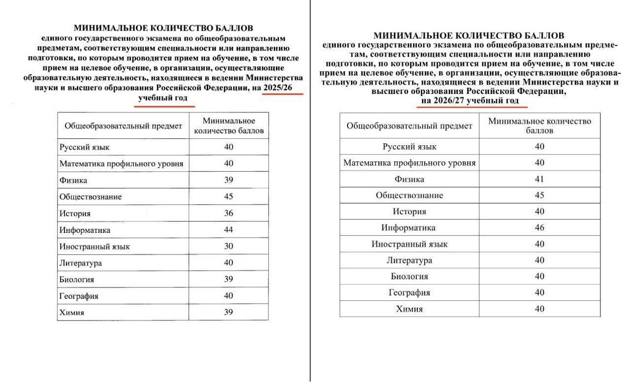 Изменения основаны на результатах приёмной кампании 2025/26. Вузы не смогут устанавливать пороги ниже этих значений.