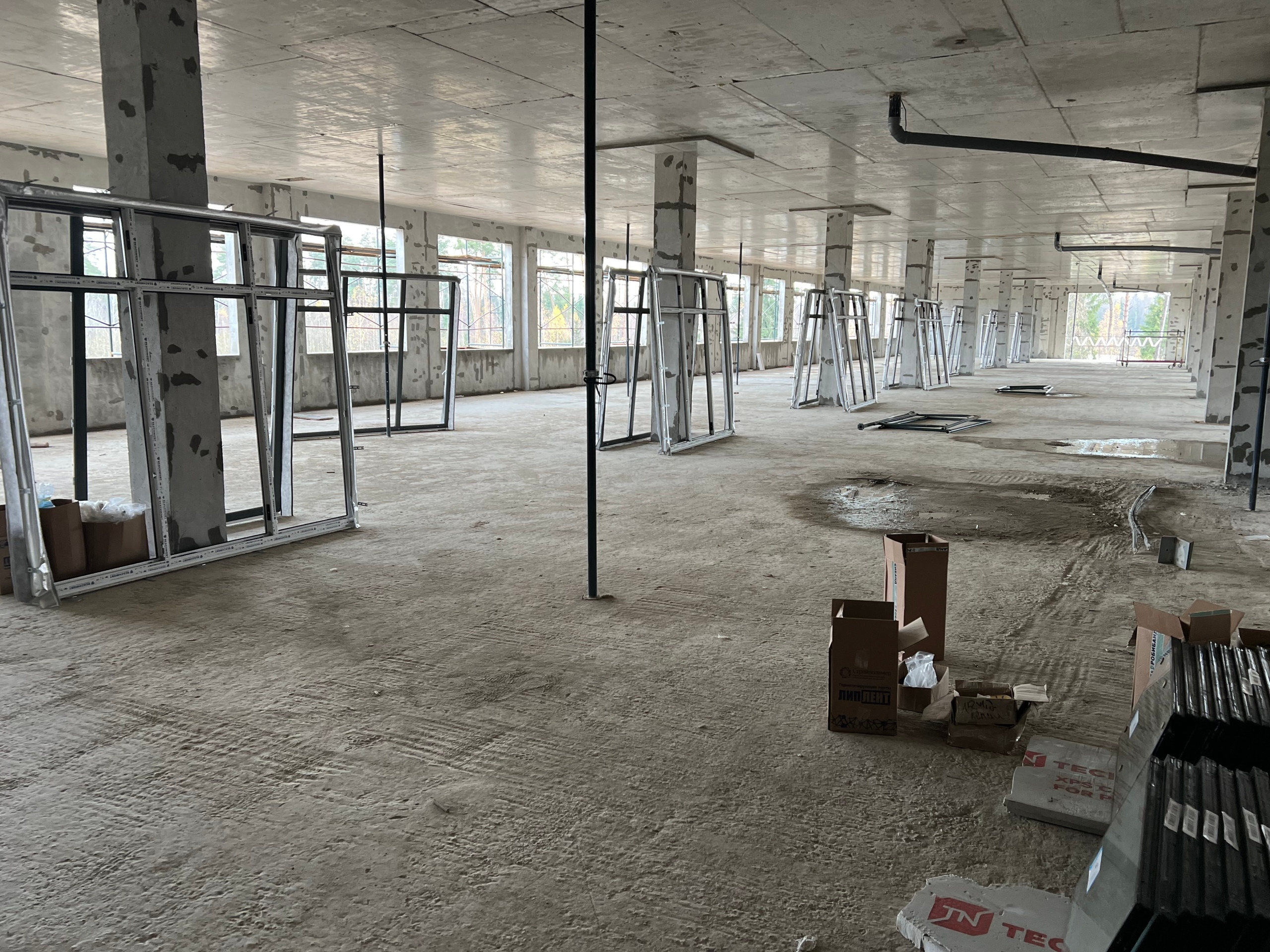 Активно продолжаются работы по: устройству лесов у здания школы, подготовке проемов для монтажа витражей, монтаж окон 1-го этажа школьного здания,