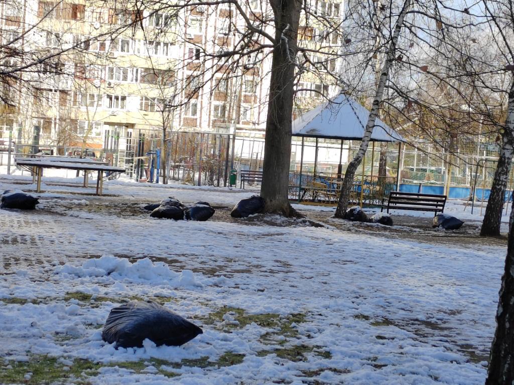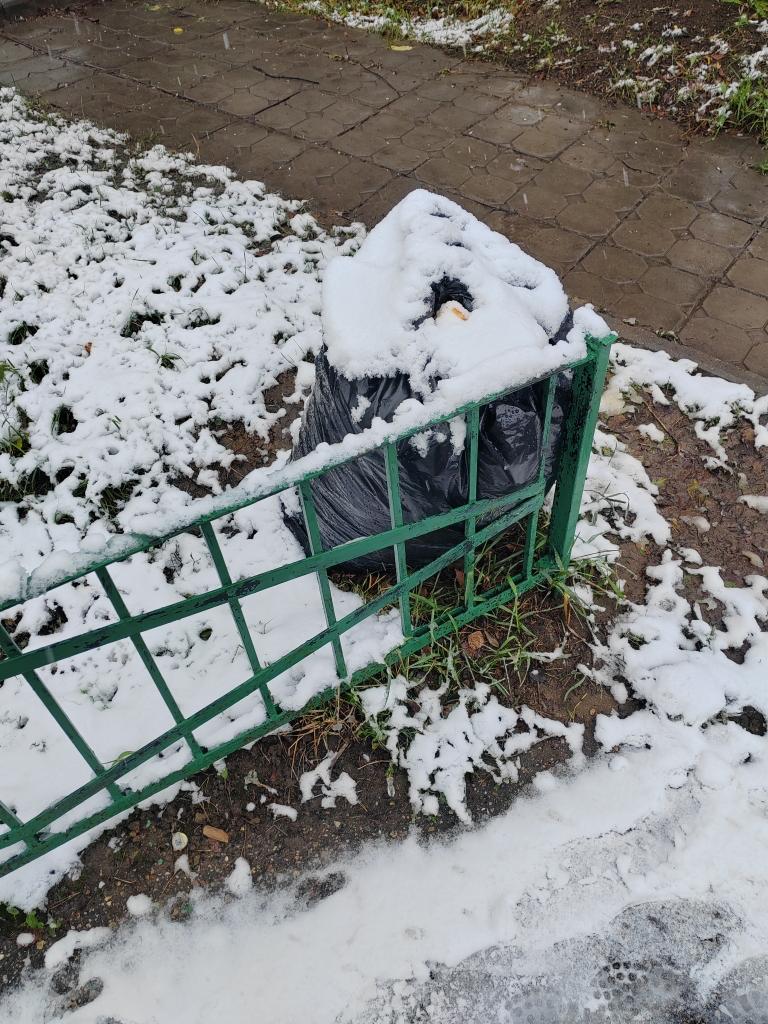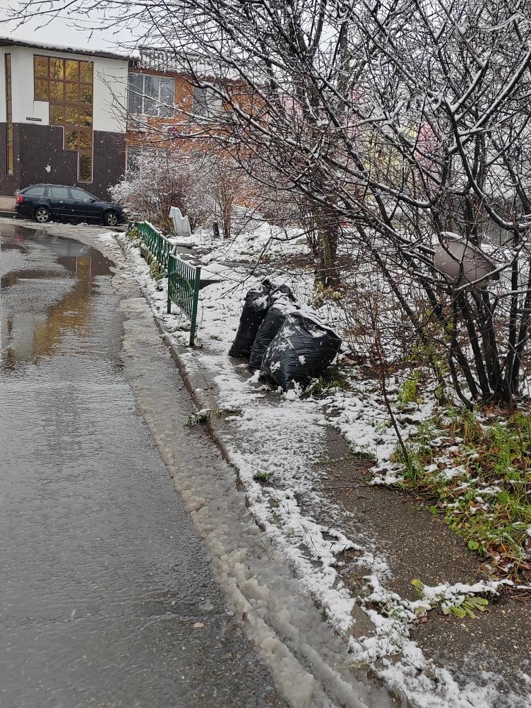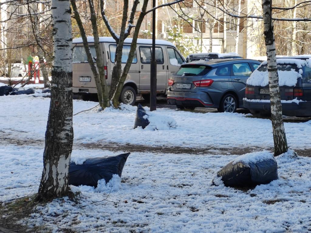 А уже начались ливневые дожди, выпал снег, который их припорошит и мешки примёрзнут к земле (фотографии от 15.11. 2025 — 16.11.2025 прилагаю — во вложении ).