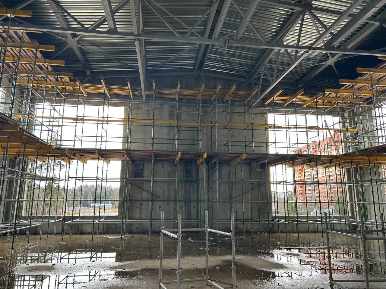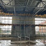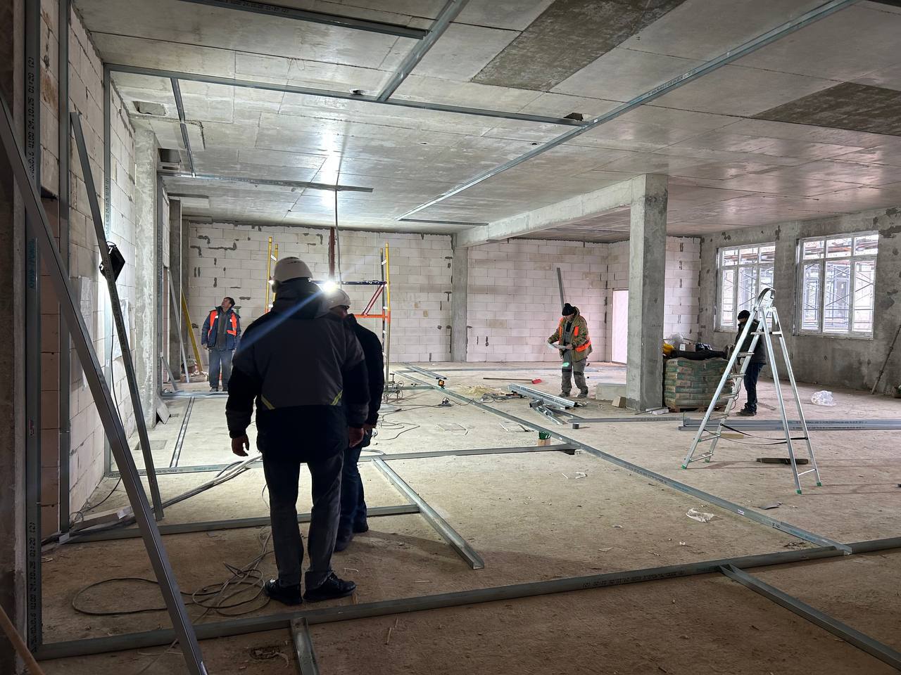 Идут работы по подготовке проёмов под монтаж витражных конструкций; устройству каркасных перегородок, фасада, примыканий с утеплением детского сада; устройству витражных конструкций школы; устройству профнастила кровли актового зала и кровли спортивного зала. Степень готовности объекта- 44%.