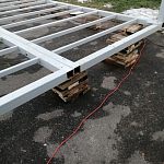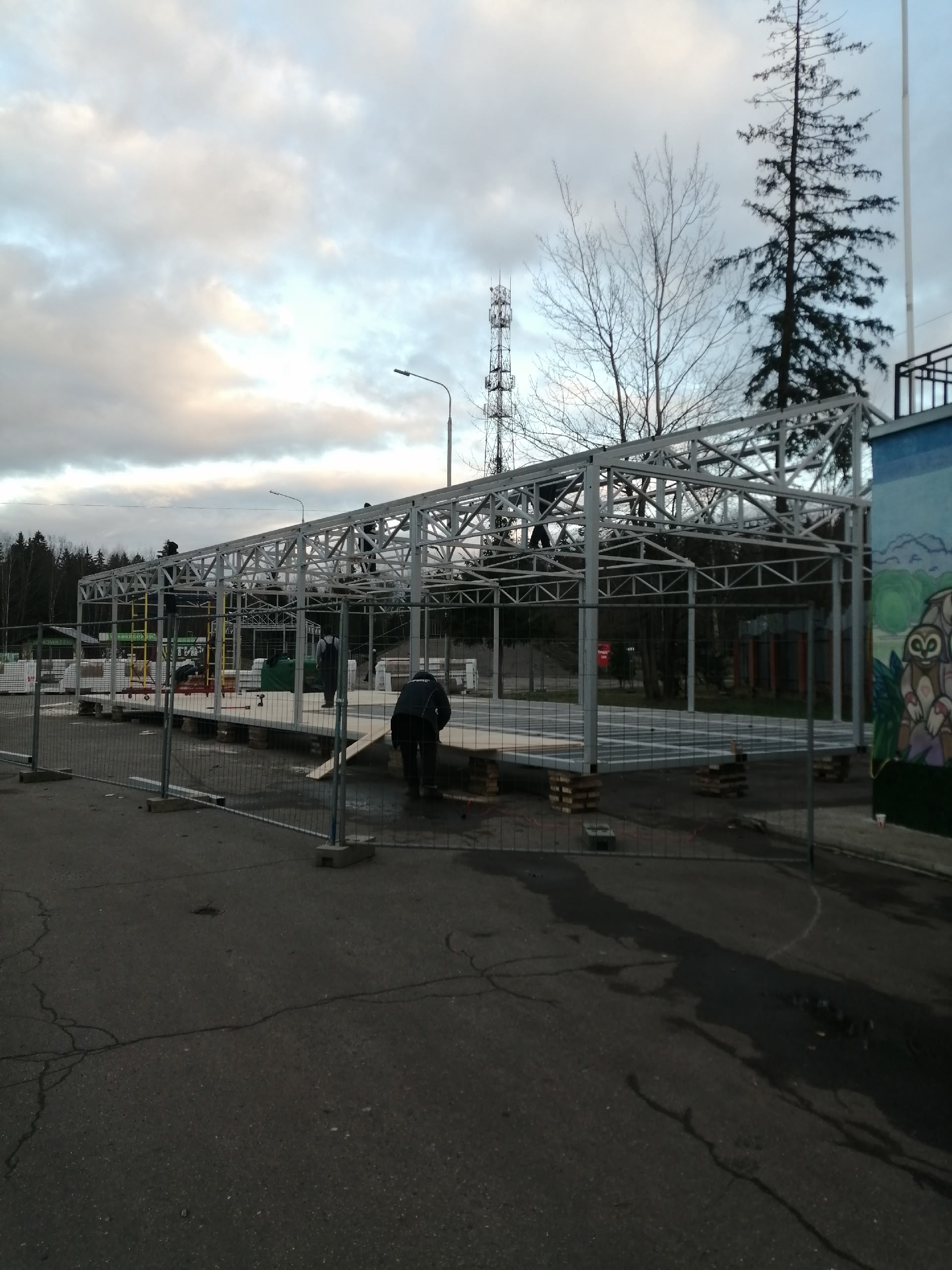 Установка металлической конструкции на деревянные дощечки в городском парке