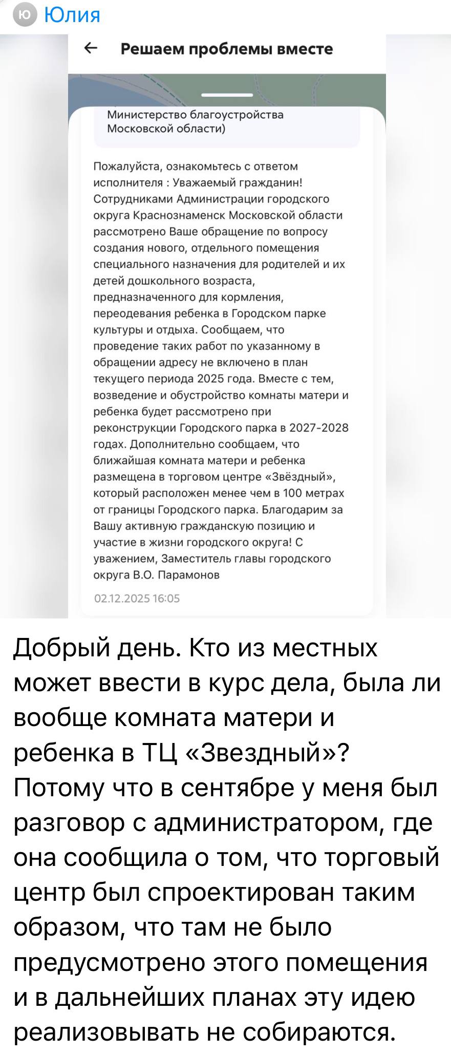 Почему Администрация города отправляет в ТЦ Звездный для доступа к комнате матери и ребенка, если, по словам администрации ТЦ, такой комнаты нет, изначально не предусмотрена в проекте ТЦ и её создать там невозможно??