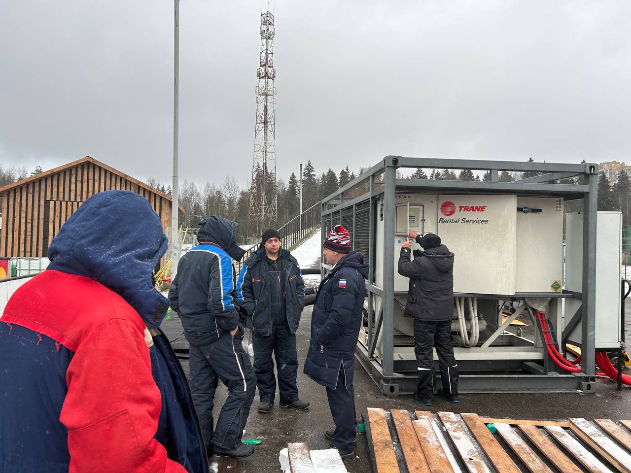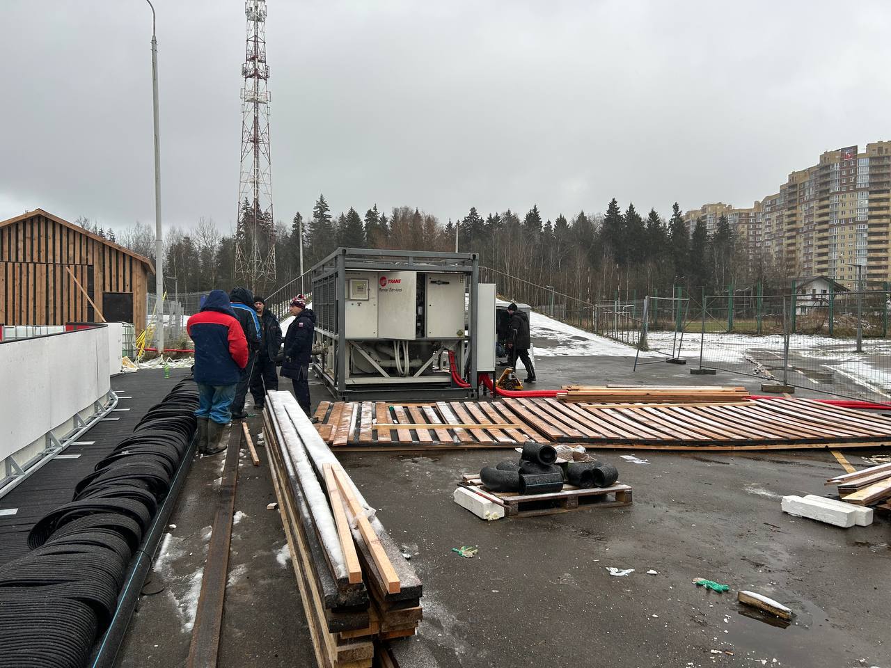В настоящее время проводится подключение холодильной системы для обеспечения комфортного пользования сезонного катка.