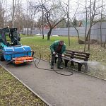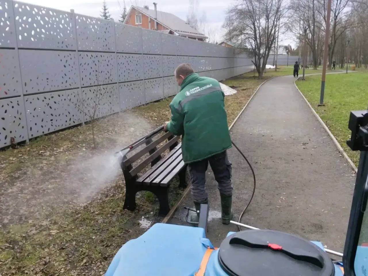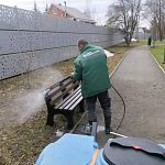 Один из видов работ — мойка скамеек, урн и столбов освещения.
