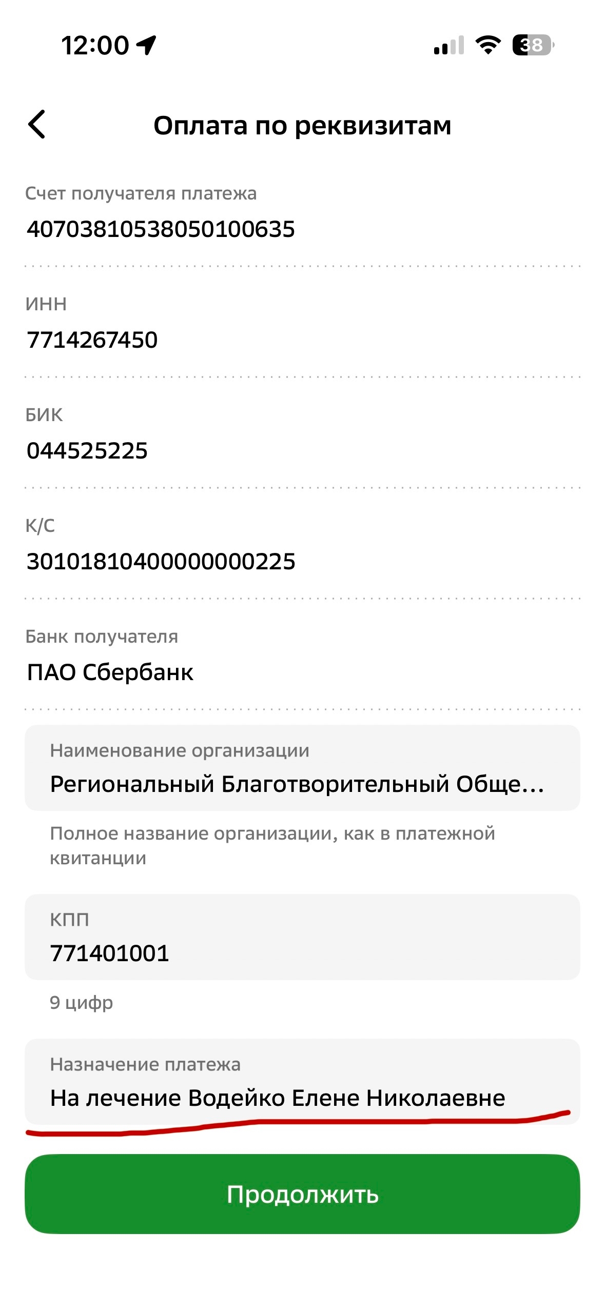 Назначение платежа: НА ЛЕЧЕНИЕ ВОДЕЙКО ЕЛЕНЕ НИКОЛАЕВНЕ