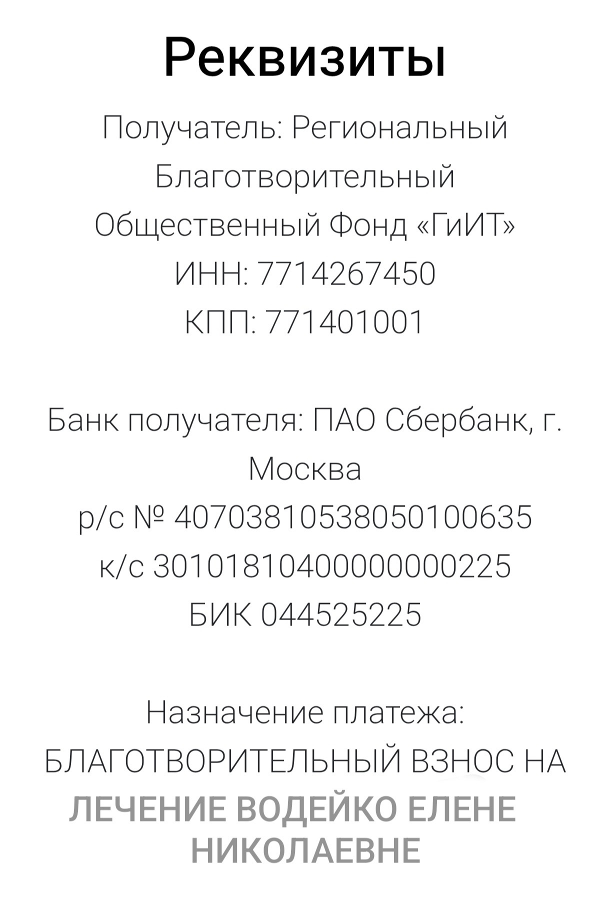 В назначении платежа ОБЯЗАТЕЛЬНО укажите: «На лечение Водейко Елене Николаевне».