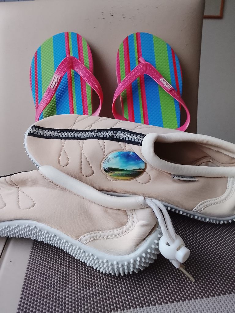 1. Коралловые тапочки. Хлопковый верх. Р-р 38. Б\у. В отличном состоянии. Удобны на галечном пляже. Цена 700 руб. 2. Вьетнамки. Новые. Р-р 38. Цена 250 руб.