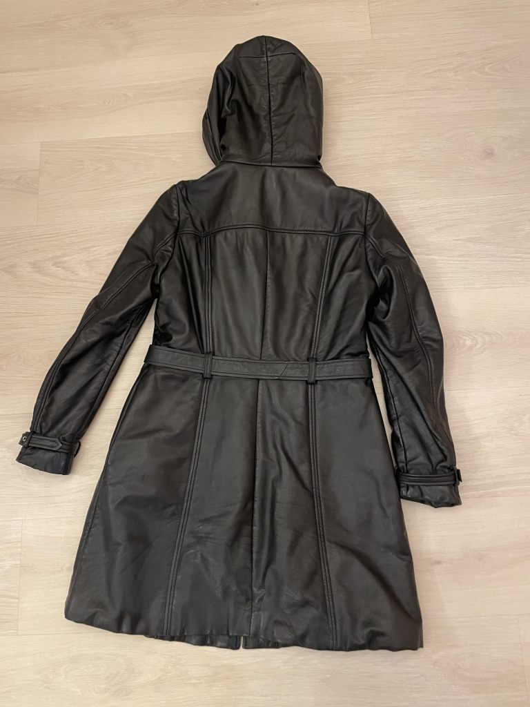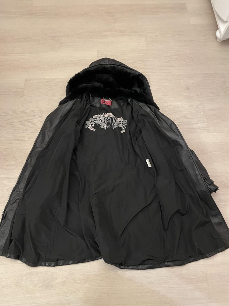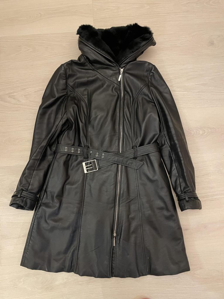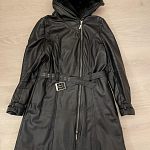 Пальто кожаное женское утепленное, осень-весна, размер 44, капюшон и пояс. 5000₽