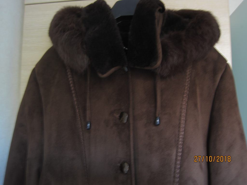 Дубленка женская (искусств.). С меховым воротничком и отстегивающимся капюшоном. С красивыми пуговицами. Р- р 52. Цвет - темно-коричневый. В хорошем состоянии.