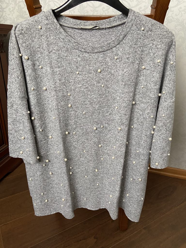 Блуза трикотажная серая с коротким рукавом, украшенная жемчужинами. Фирма ZARA TRAFALUC. Размер 46 (М).; EUR 26. В хорошем состоянии. ( обьем груди 55 см.*2; длина 61 см. (Фасон Оверсайз ). Торг уместен.