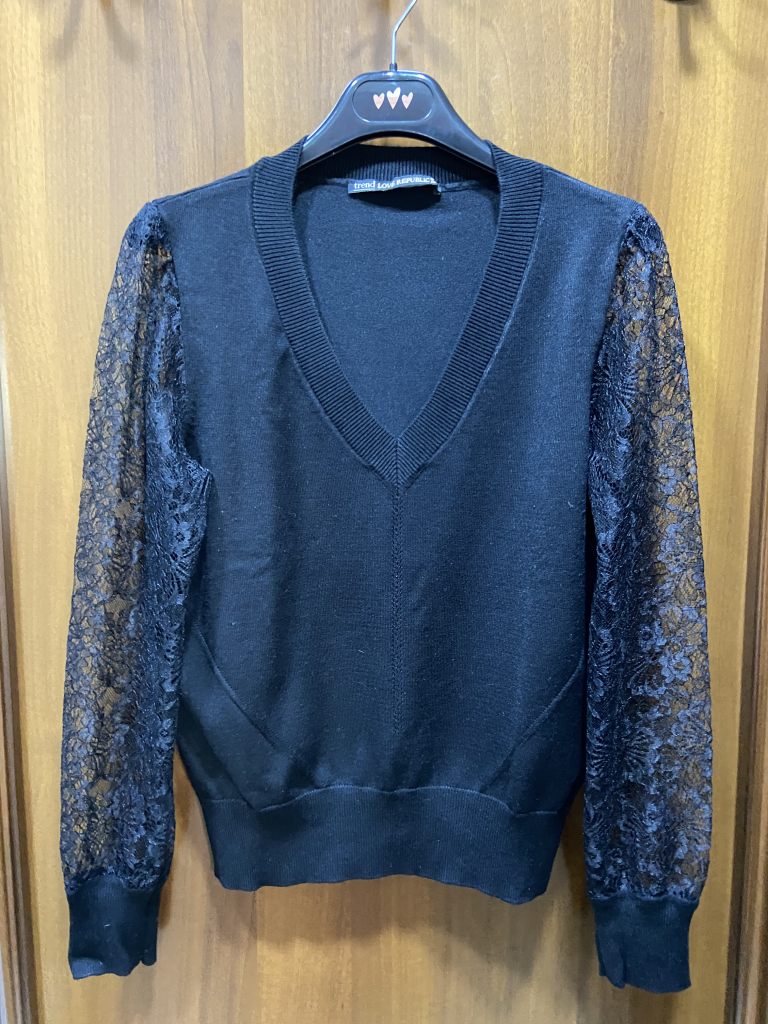 Свитер трикотажный черного цвета с гипюровыми рукавами. Размер RUS 44; EUR 38. Фирма trend LOVE REPUBLIC. В хорошем состоянии. Торг уместен.