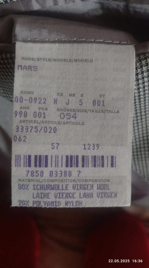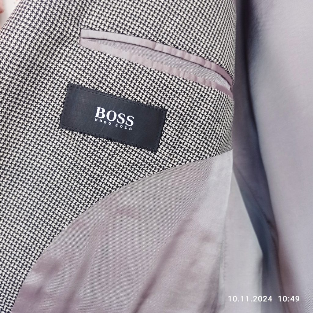 Мужской пиджак легендарной фирмы «HUGO BOSS», модель MARS, классический силуэт, размер 54, рост 182-186. Цвет серый в очень мелкую клетку, подкладка светло-серая, однотонная.