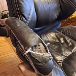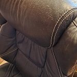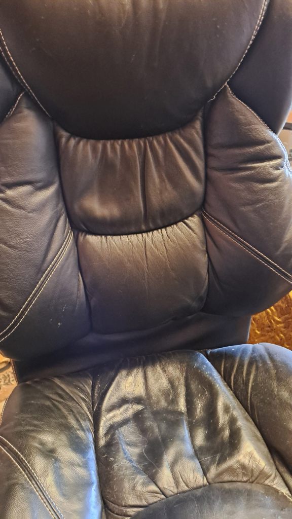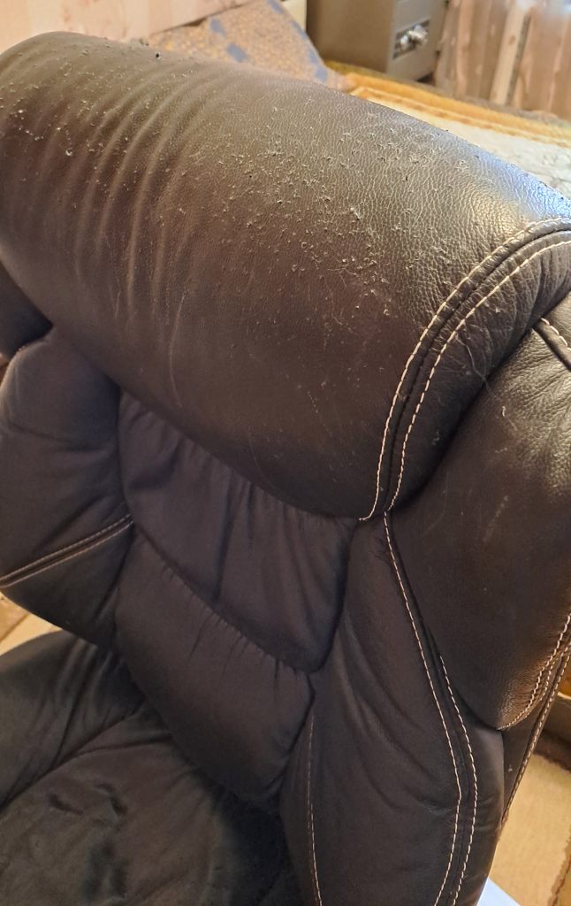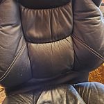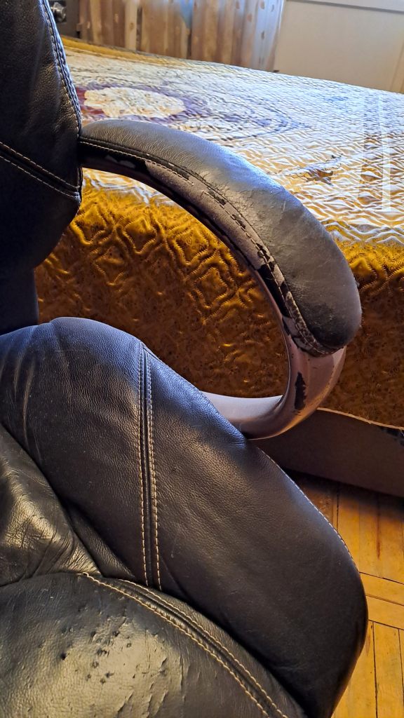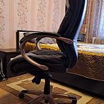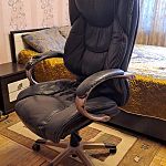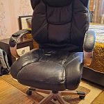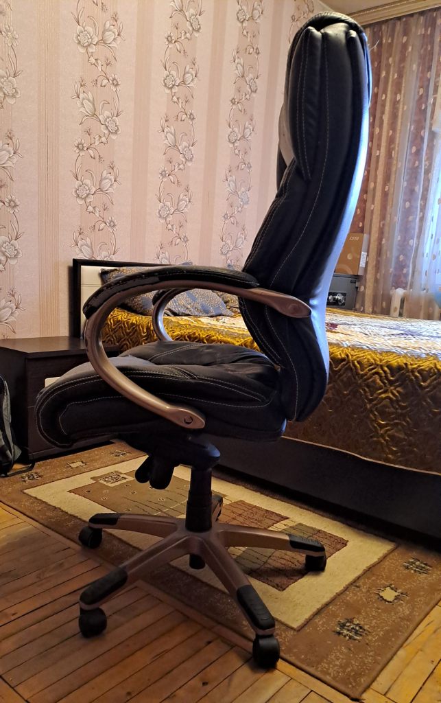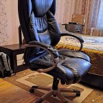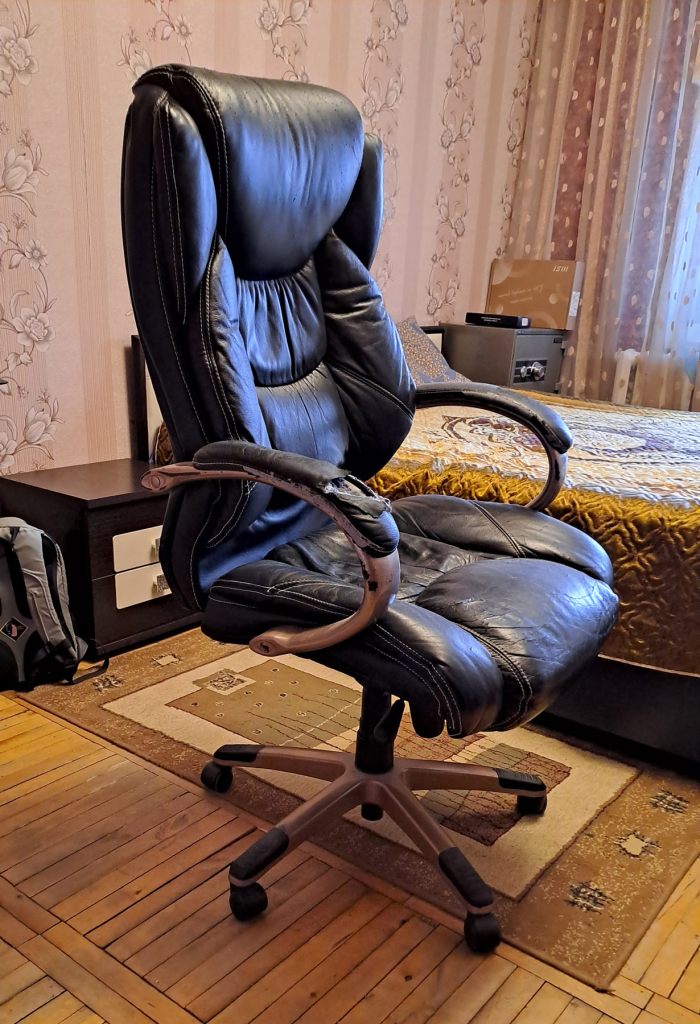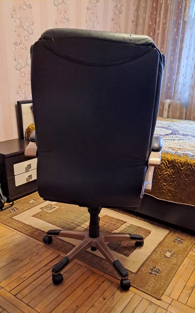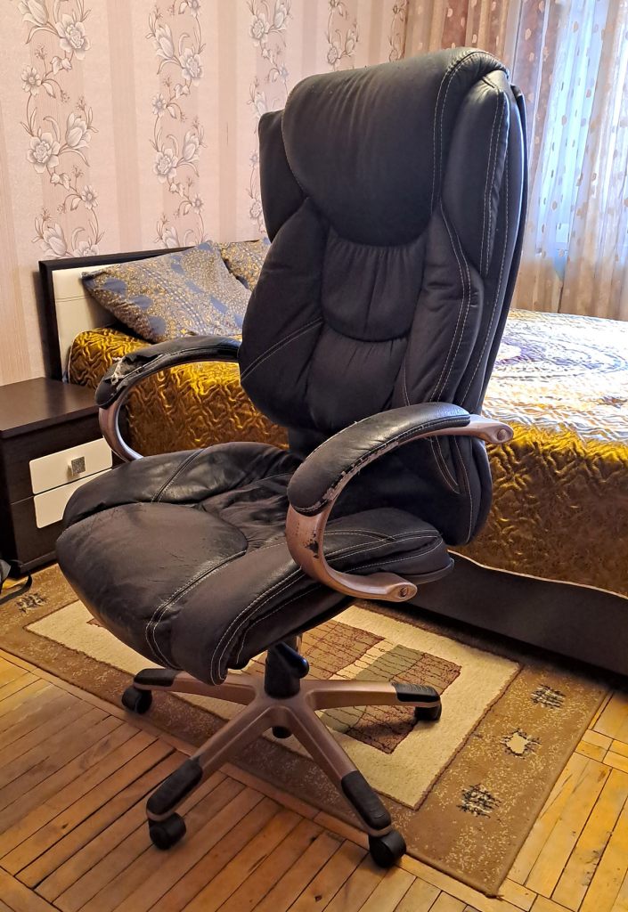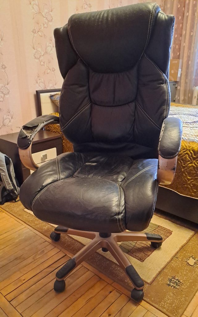 Кожаное кресло руководителя в удовлетворительном состоянии. Высокое и тяжелое. Газлифт. Качание. Кожа на одном из подлокотников порвана, есть потертости и зацепки, небольшой крен влево в определенном положении горизонтального поворота. В целом состояние удовлетворительное и полностью рабочее.