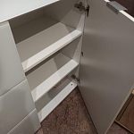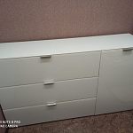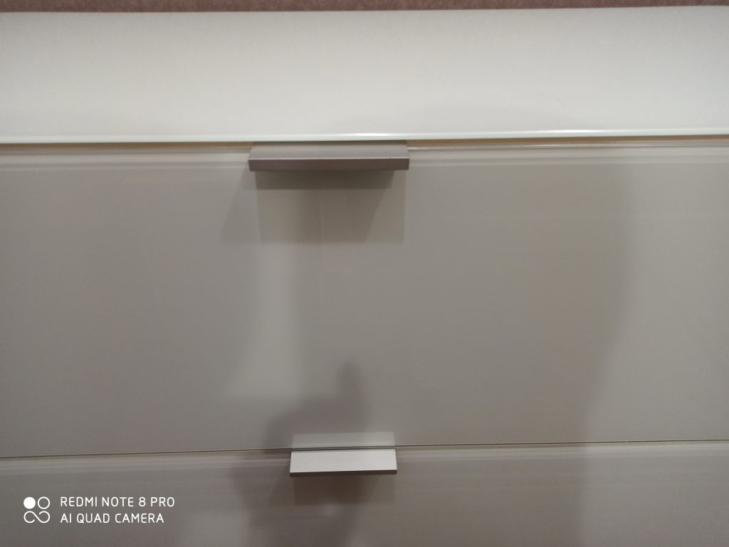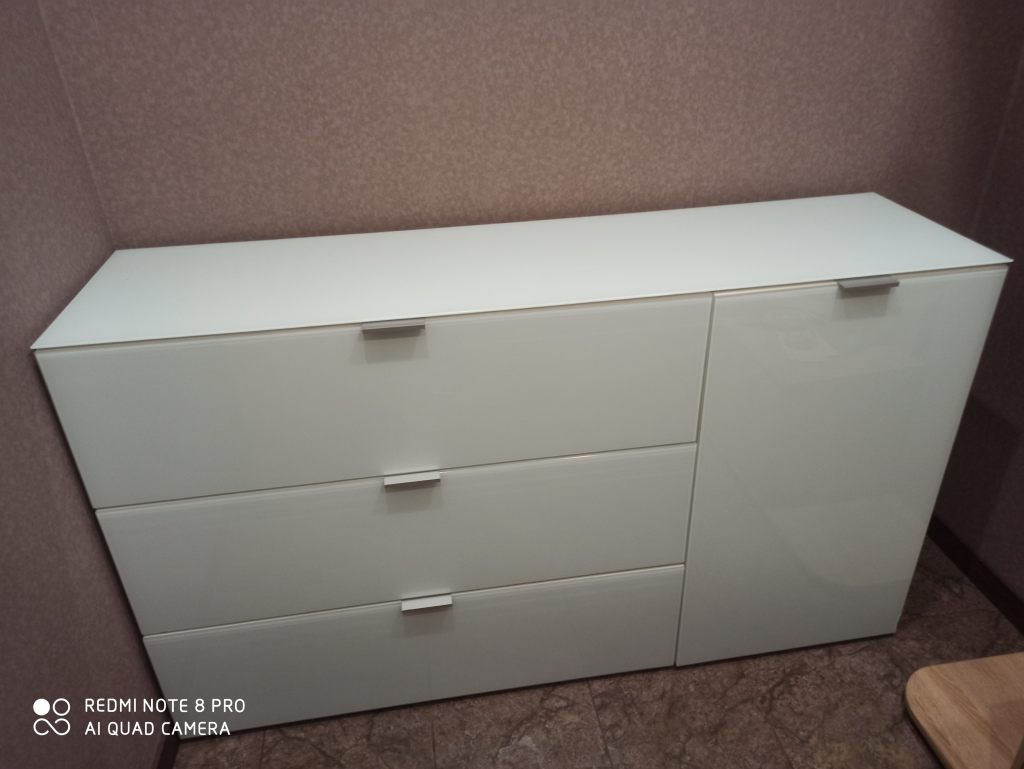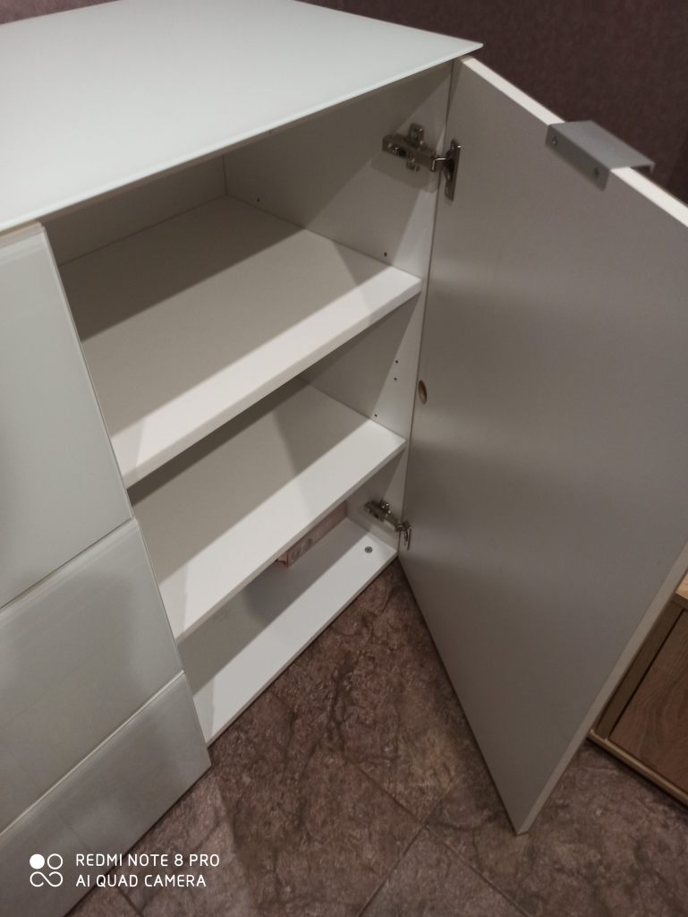 Он покрыт стеклом, белый, качественный, фурнитура с доводчиками, всё исправно работает.