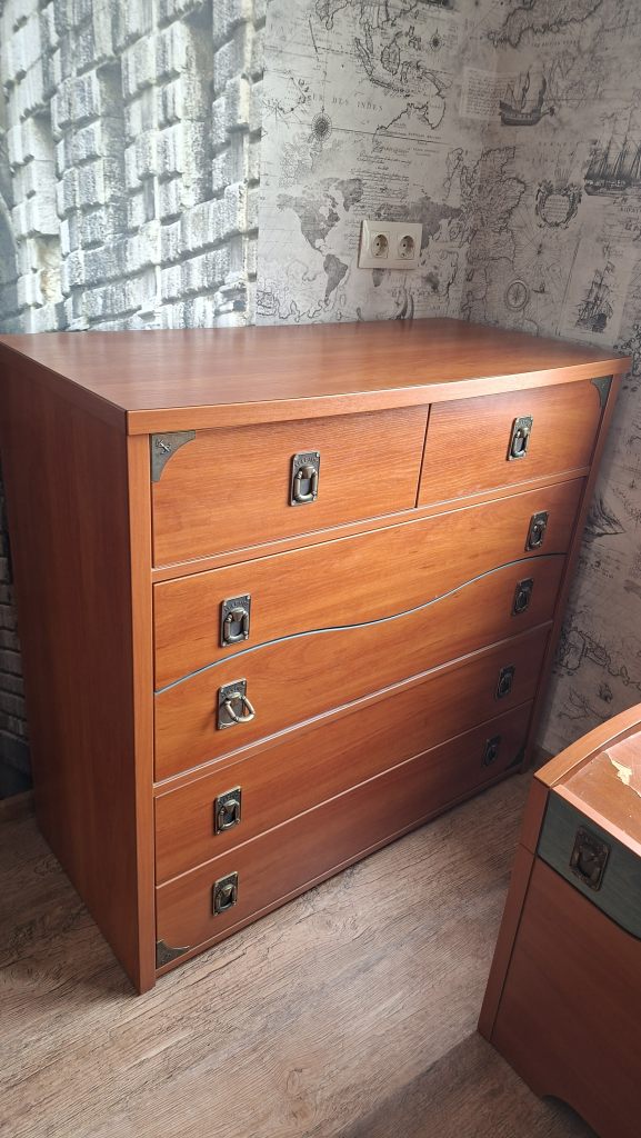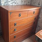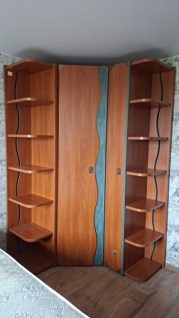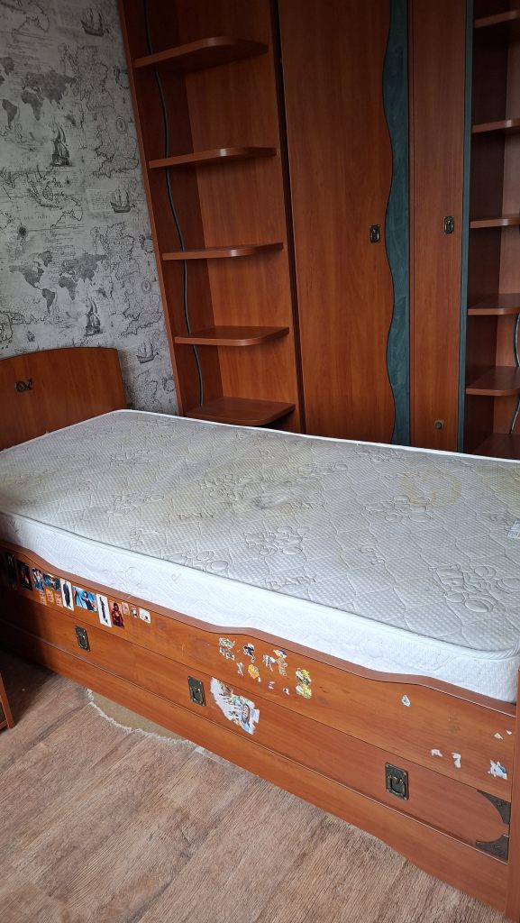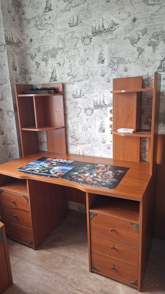 Продаю комплект мебели, который включает в себя угловой шкаф, комод, стеллаж, стол, кровать с выкатными ящиками.