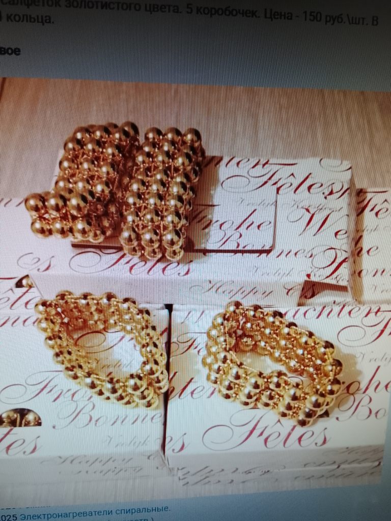 Кольца для салфеток золотистого цвета. 5 коробочек по 4 кольца в каждой. Цена : 1 коробочка - 200 руб.