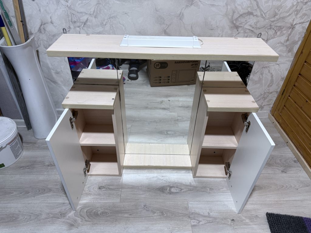 Раковина со смесителем. Работает. Не течет. Шкаф с подсветкой. Лампы в наличии. Ручки также.