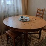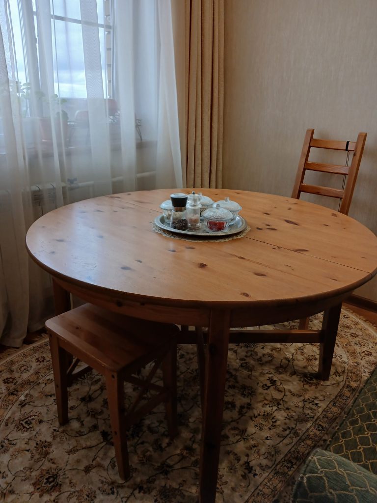 Продам круглый деревяный раздвижной стол Икея(оригинал). Столешница диаметр 126 см в собранном виде, 171 см в разобранном. Высота столешницы 25мм. Собирается и разбирается легко, быстро и просто. Чем мебель Икея и славится: простота и надежность. Есть царапки ( как без этого) столом пользовались, но на его функциоеальность и общий вид это не влияет. В придачу отдам 2 стула и 1 табурет , тоже Икея. Цена 10 000. Вывоз и разбор силами покупателя. Возможен торг