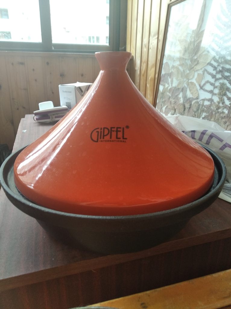 Марокканская посуда для тушения мяса, круп и овощей. Крышка выполнена из высокотемпературной керамики, цельная, без отверстия для выхода пара. Антипригарное покрытие, подходит для индукционных плит, объем 2.4 л, диаметр верха 29 см, вес 4.4 кг. Пользовались мало, нам не пошло.