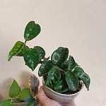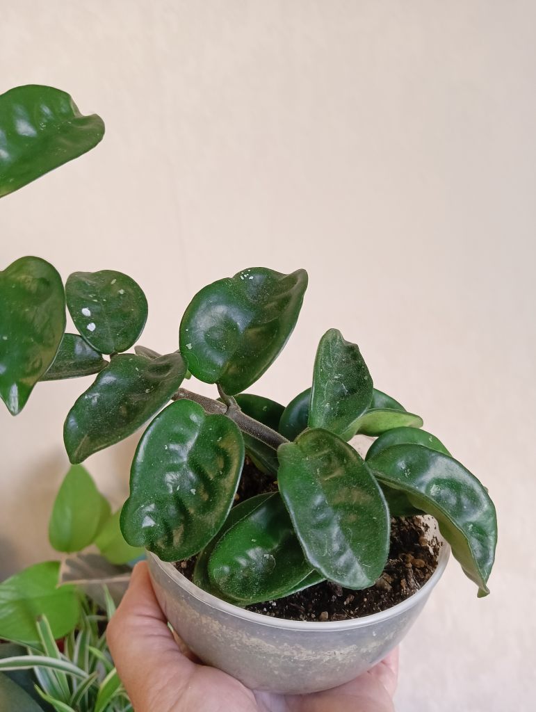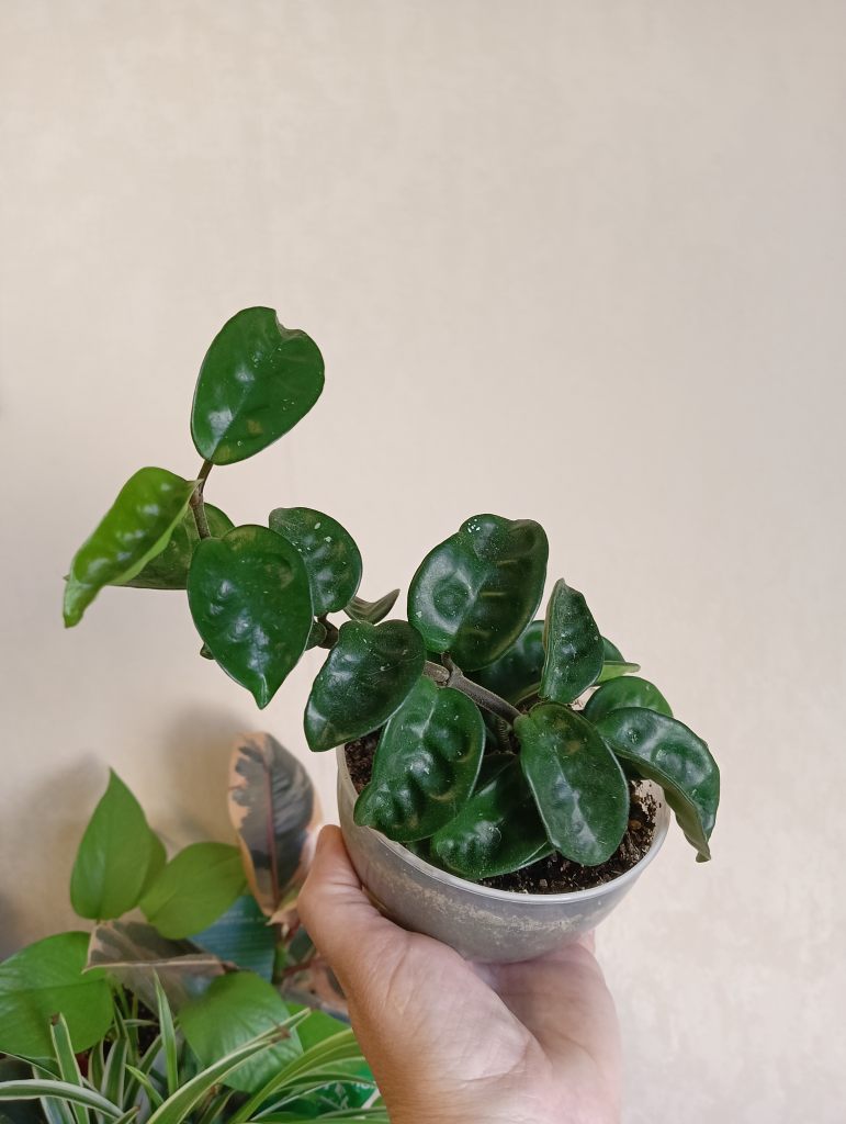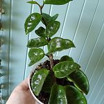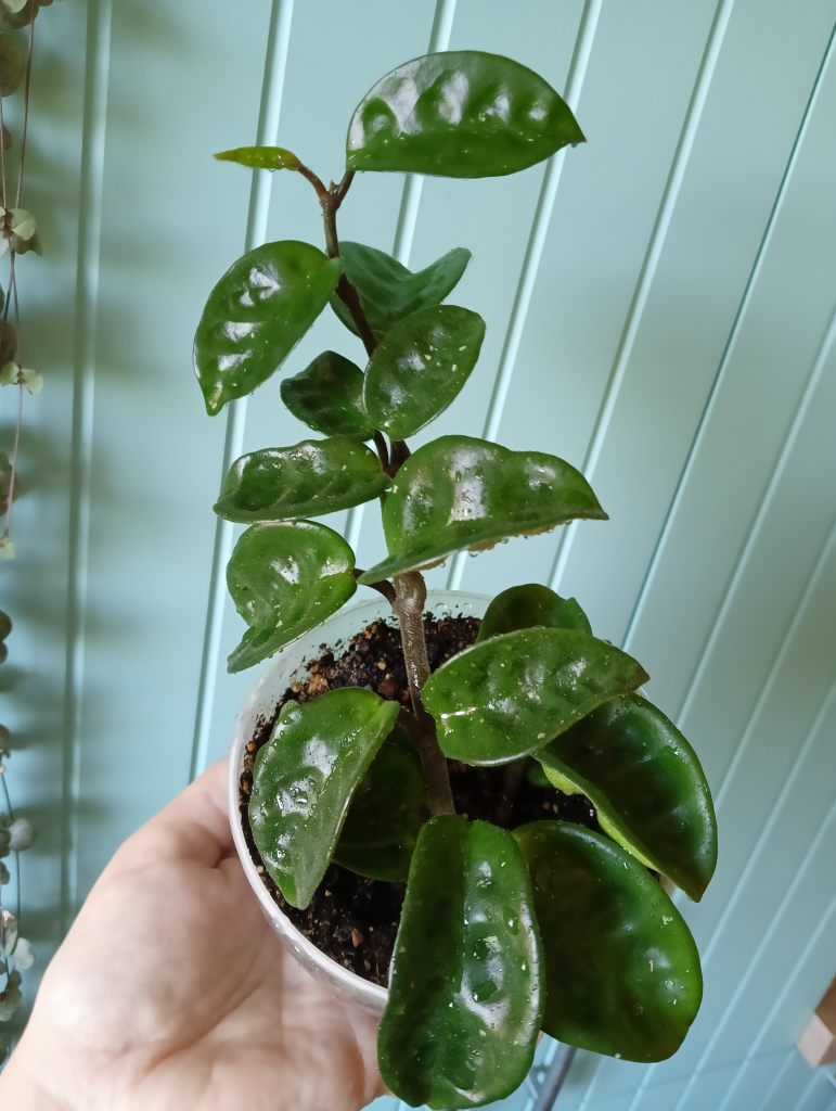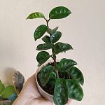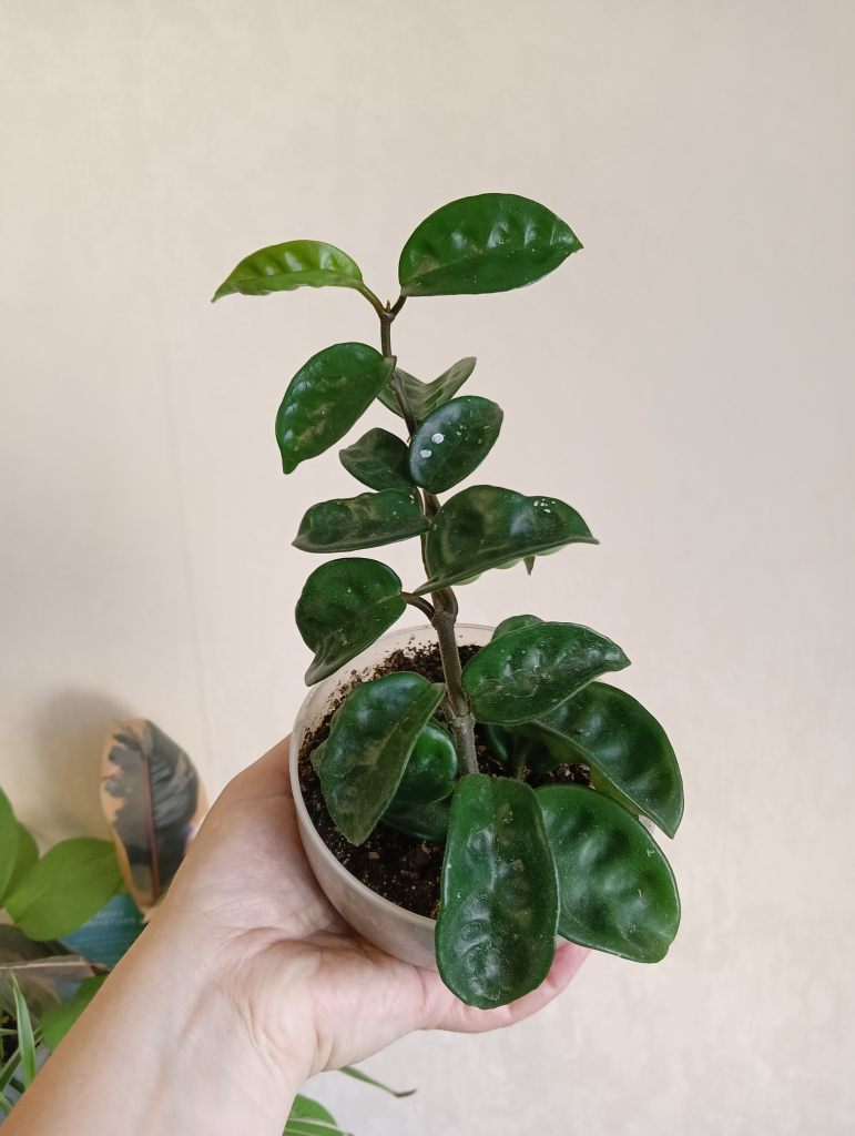 Хойя карноза кринкл-8. Активно растет (последнее фото было сделано 5 дней назад, для сравнения). Имеет характерный рельеф плотных листьев, который не пропадает с ростом, и короткие междоузлия.