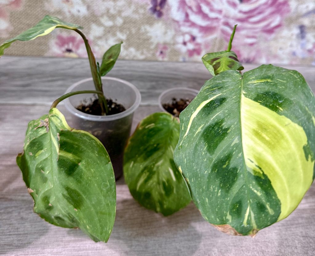Поверхность листовых пластин украшена хаотичными неровными ванильно - желтыми пятнами и штрихами.
