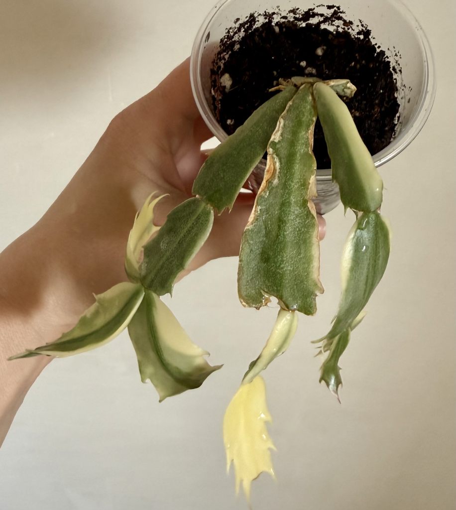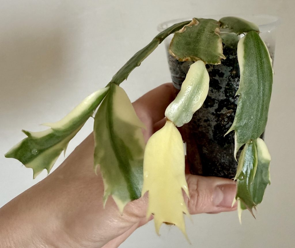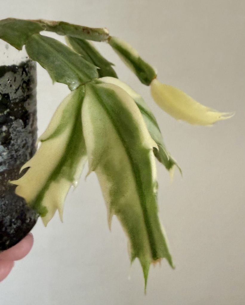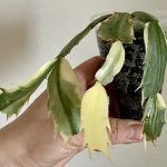 Листья (сегменты стебля) светло-зелёные с кремово-жёлтой вариегатностью. Сегменты могут достигать 3–6 см в длину.