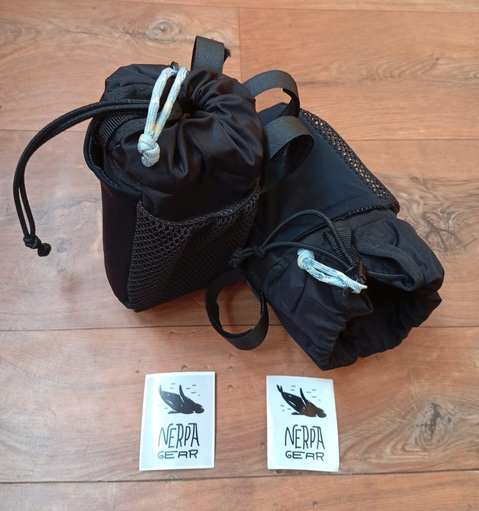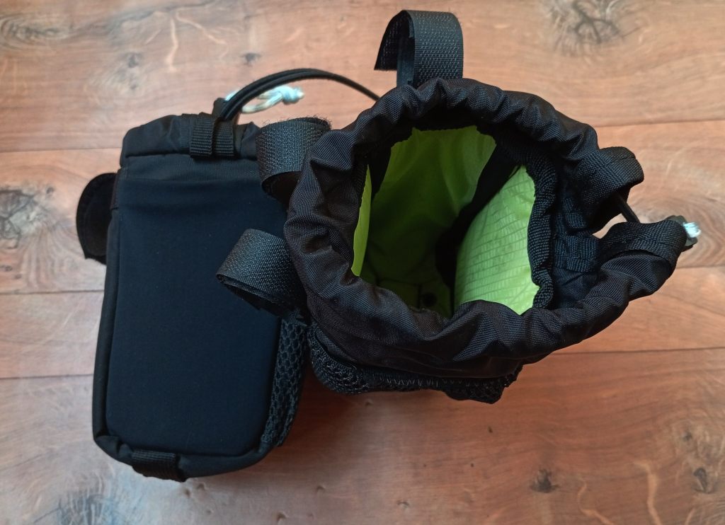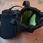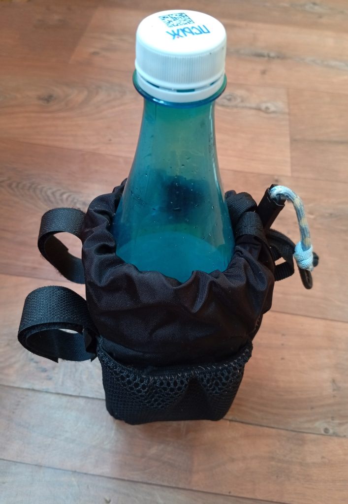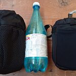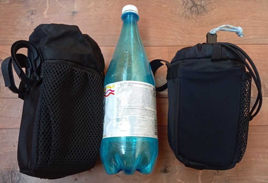 Это решение проблемы питания на ходу. В одну сумку помещается еда на длинный ходовой день или большая фляга с водой. При желании можно засунуть и полторашку (на фото бутылка емкостью 1 литр).