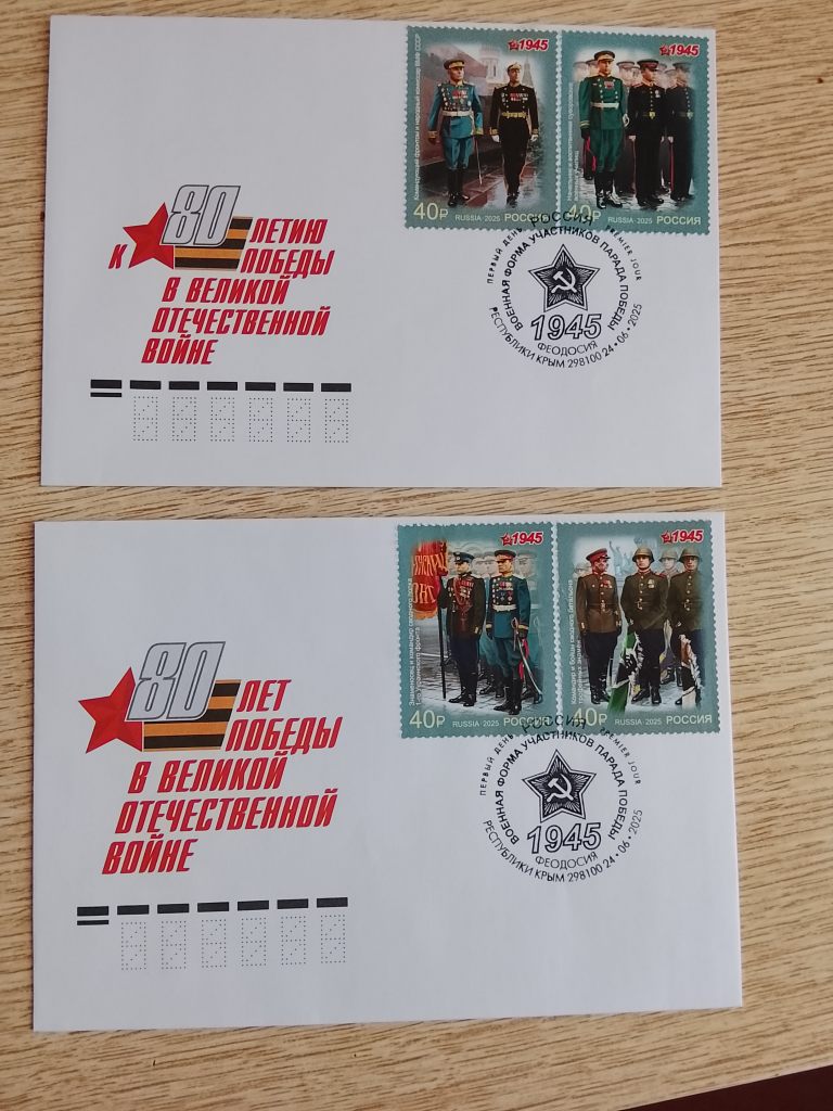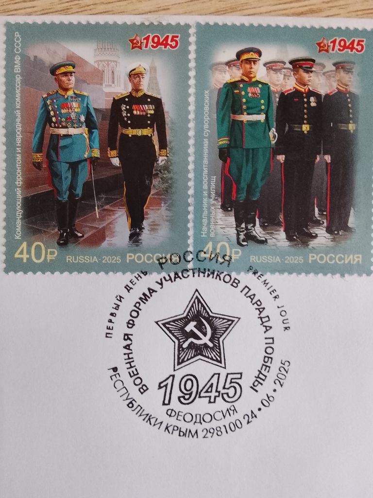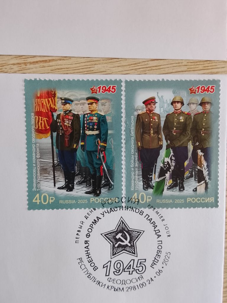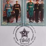 Конверт с марками мундиров военнослужащих, участвовавших в 1945 году в Параде победы. цена - 400 руб.