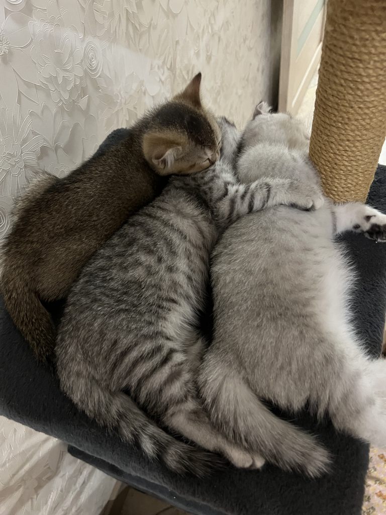 Родились 24 октября. Перешли на взрослый корм, лоток освоили. У каждого свой характер, но все активные , игривые, любознательные. Котята- в домашние любимцы. Паспорта и документов нет. Проглистогонены. Прививок нет. У золотистой девочки небольшая шишка на хвостике (был сломан и не совсем ровно сросся)