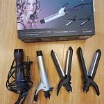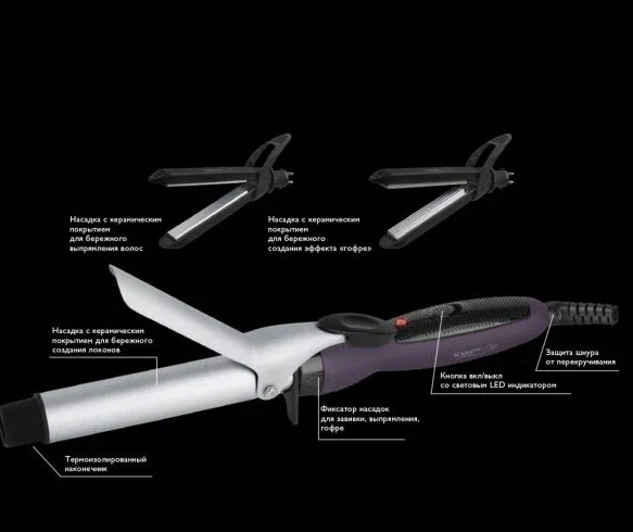 Мультистайлер керамический, быстрый нагрев, защита от перегрева, вращение шнура, индикация включения, индикация готовности к работе. Насадки: гофре, для выпрямления, щипцы для завивки.