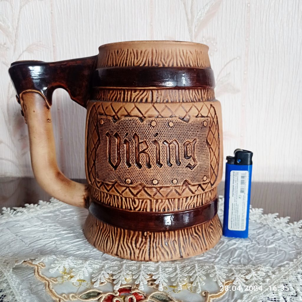 -керамическая VIKING, индивидуальная ручная работа, полный объем 1,3литра, до верхнего коричневого ободка - 1 литр. Высота кружки - 16cм, диаметр основания - 13см., диаметр горлышка - 8см.